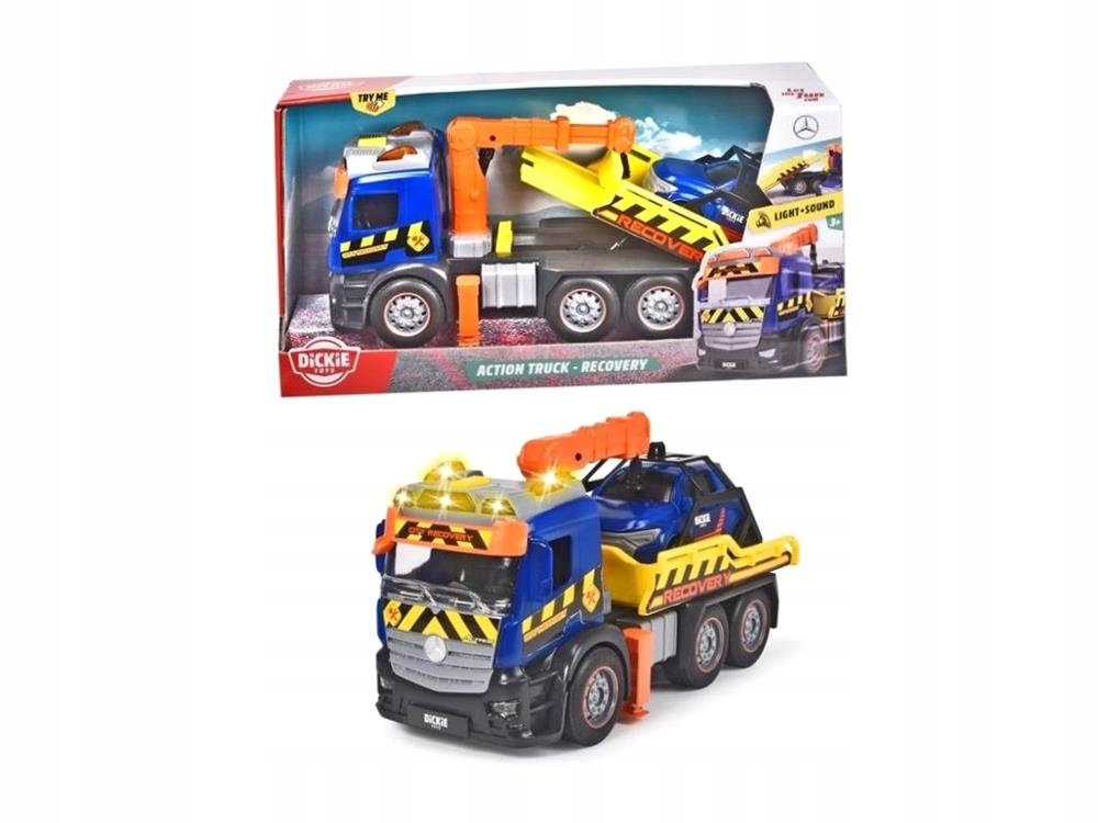 Евакуатор з фрикційним приводом за ліцензією Mercedes, з прозорими вікнами, завдяки яким можна легко побачити нанесений на карту салон автомобіля. Евакуатор має світло-звукову функцію та рухомі елементи, такі як підйомник або перекидна вантажна платформа. Додатково в набір входить транспортний засіб, що перевозиться на причепі. Іграшка має функцію Try Me. Розміри: 26 см, 3л+