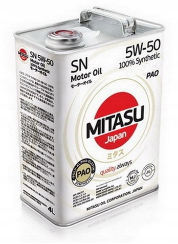 Новітні технології виробництва моторних масел виробництва MITASU Oil Corporation, Японія, дозволили MITASU PAO SN 5W-50 100% Synthetic перевершити вимоги таких виробників автомобілів, як: Toyota, Lexus, Nissan, Mitshubishi, Daihatsu, Fiat, Alfa Romeo, Peugeot та ін.