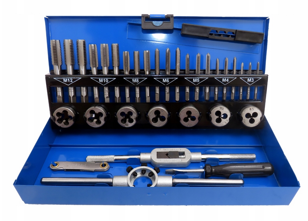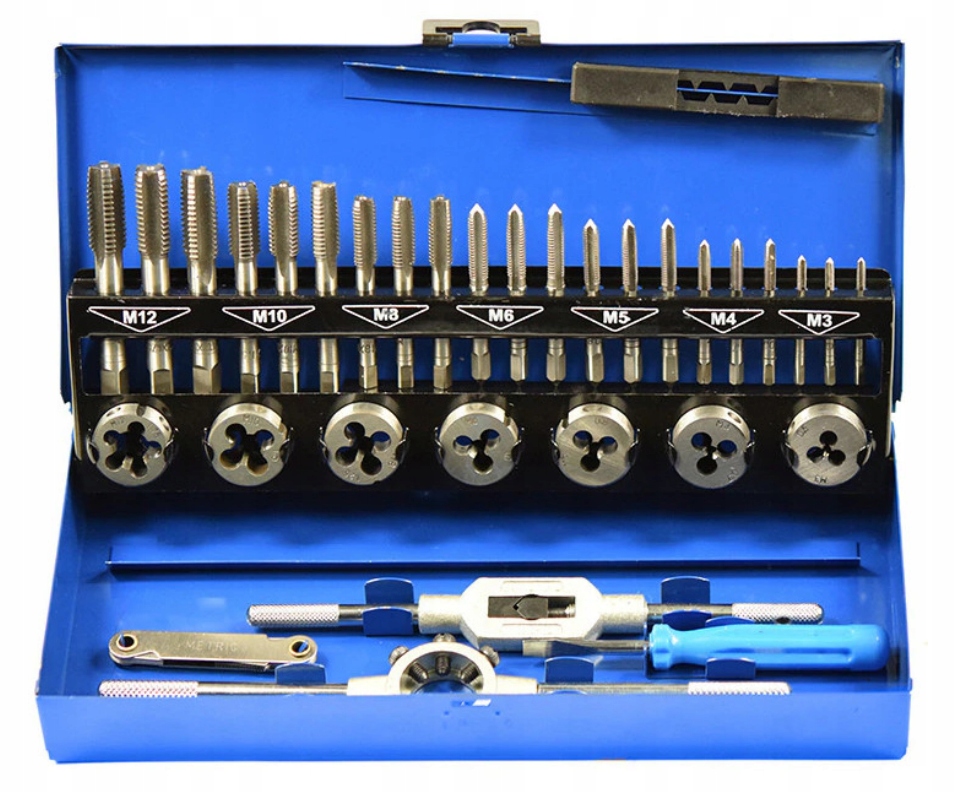 ✅ Мітчики та плашки знаходяться в практичній валізі з розмірами, позначеними під кожним інструментом. Це полегшує їх зберігання та тримає інструменти в порядку.