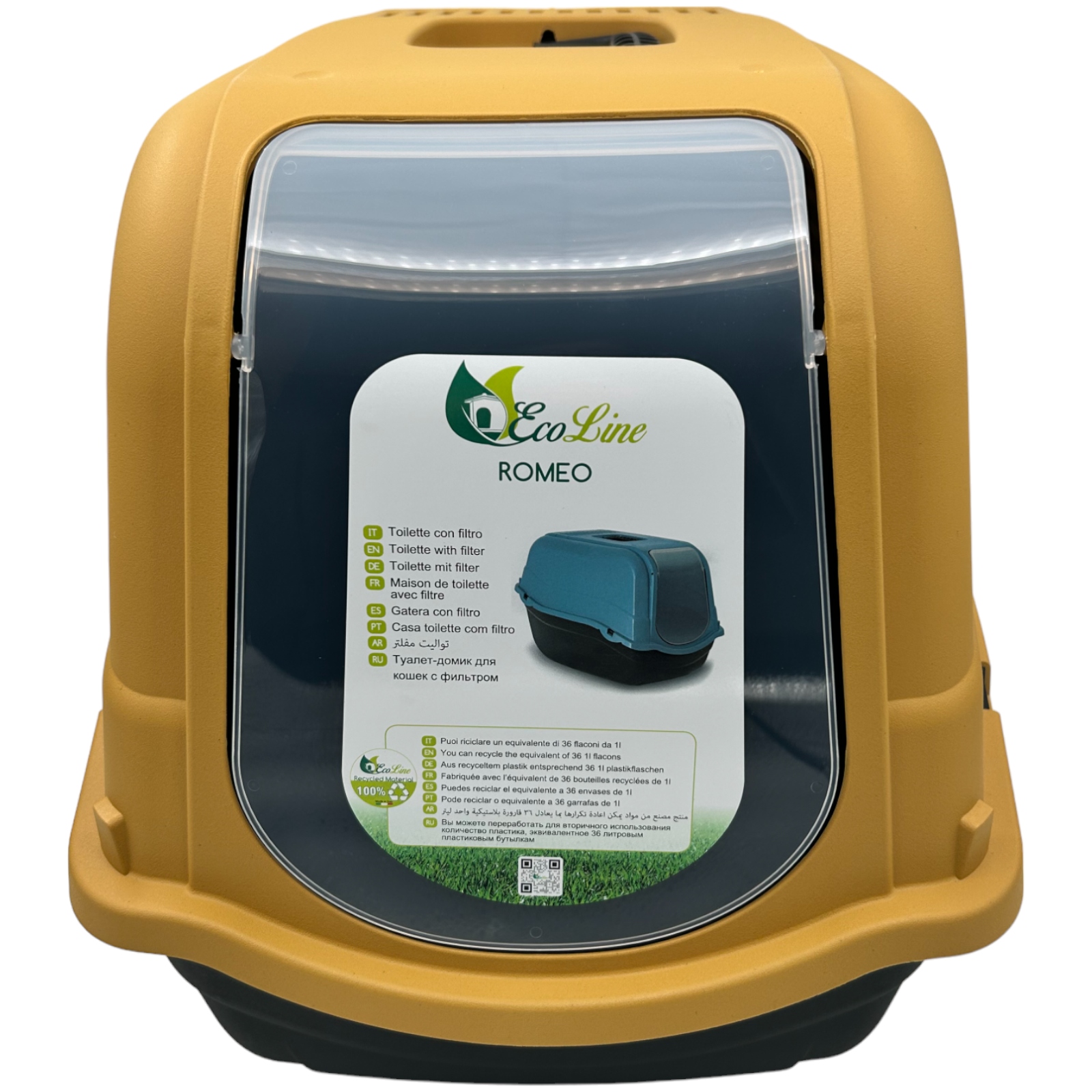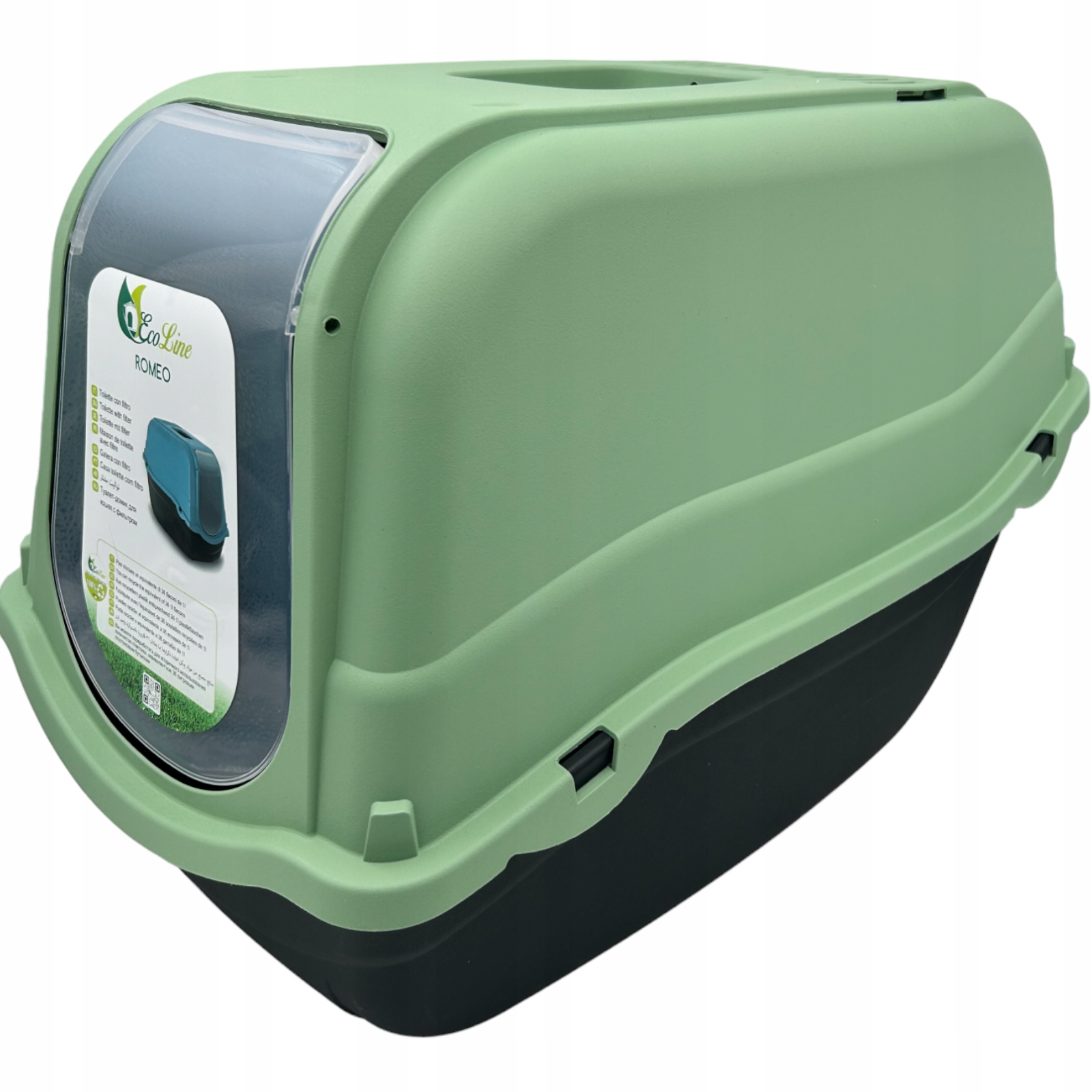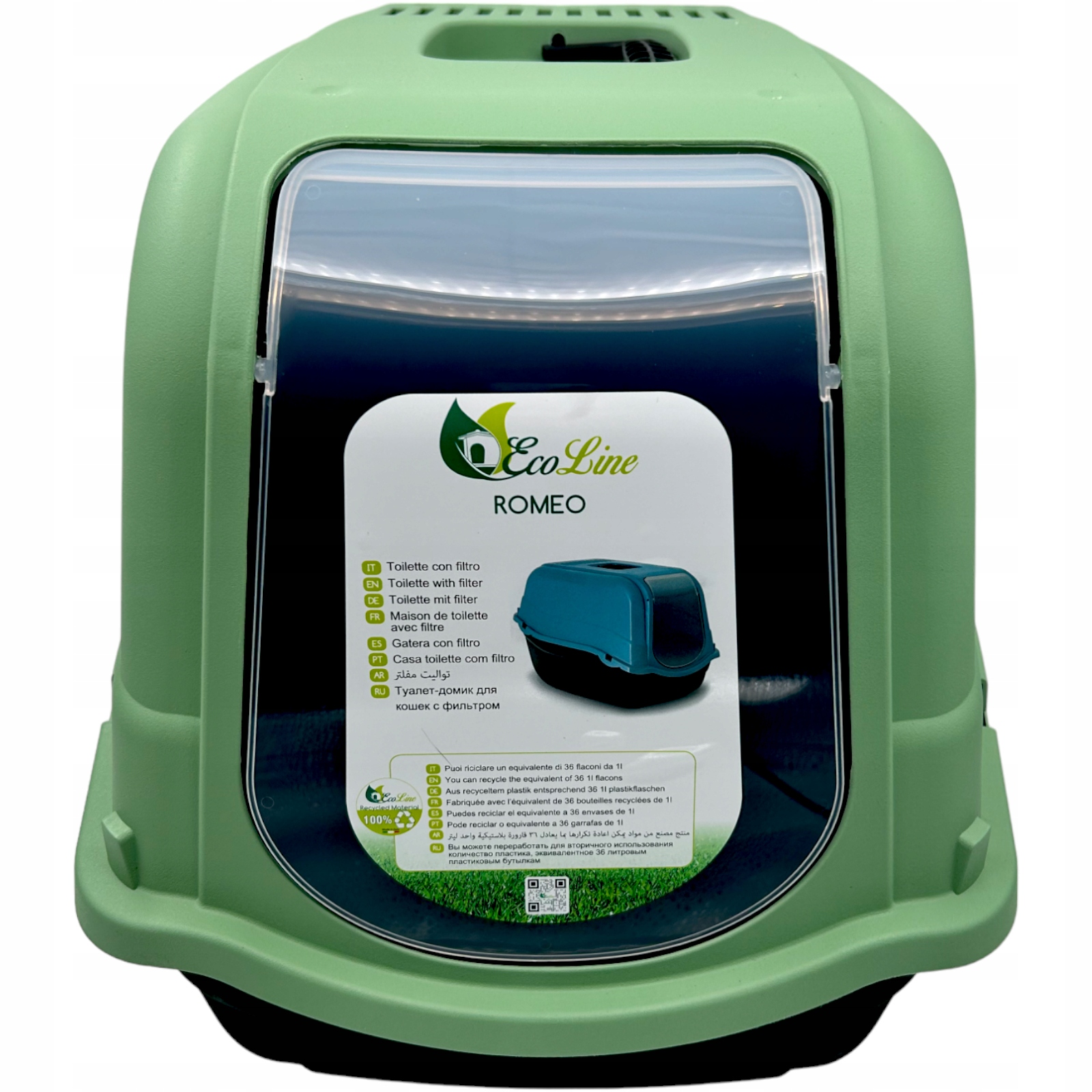 Практичний, покритий туалет для котів. Він має навісні двері, які забезпечують комфорт тварин та побудований великий, замінний вуглецевий фільтр, який поглинає неприємні запахи. Сумісний з усіма типами гравію. пластик. 4 Одна коробка для сміття Romeo Ecoline еквівалентна 36 пляшками 1L. Завдяки відповідному процесі обробки пластику, коробки для сміття дуже міцні і не відрізняються від коробки для сміття з "нормального" пластику. Давайте купуємо розумно - давайте будемо еко!