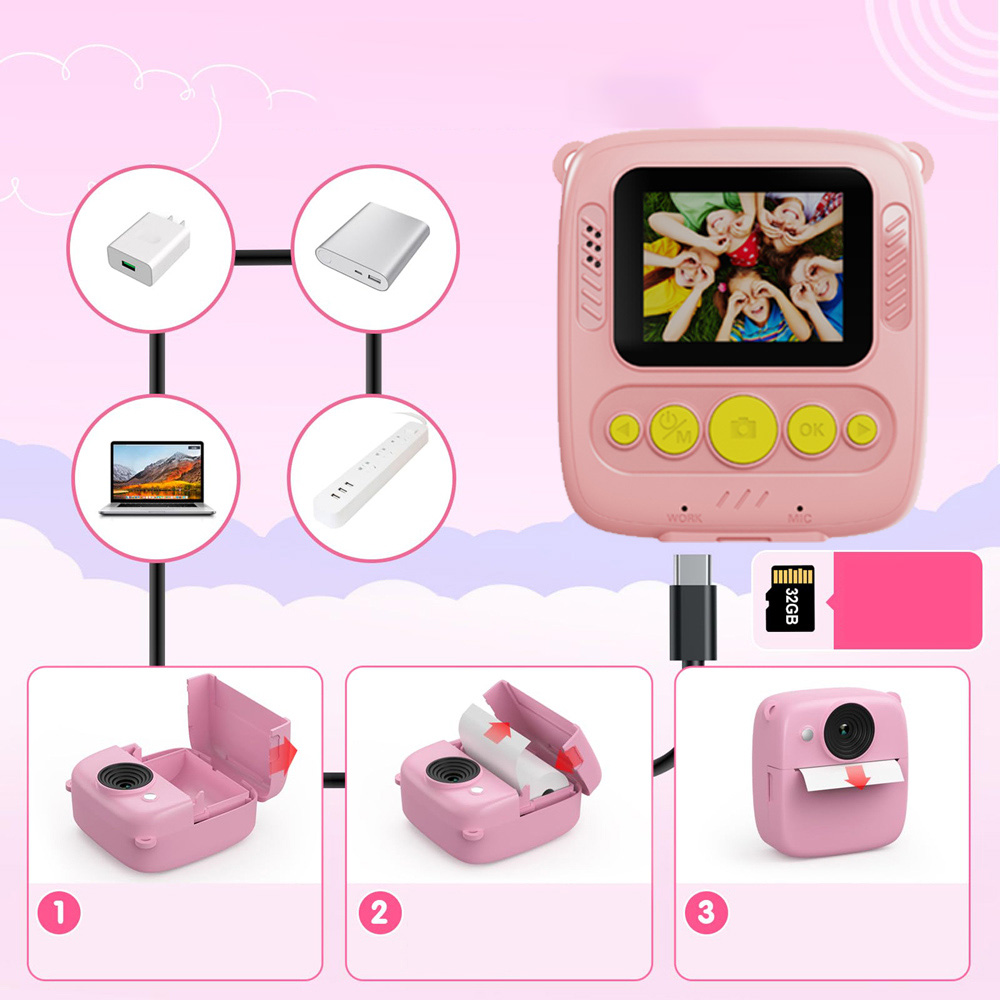 Миттєва камера дітей використовує технологію безквартирного друку, яка дозволяє миттєво друкувати свої захоплені фотографії лише одним натисканням спеціальної кнопки. Діти можуть намалювати свої улюблені кольори на фотографіях і написати те, що вони хочуть сказати.