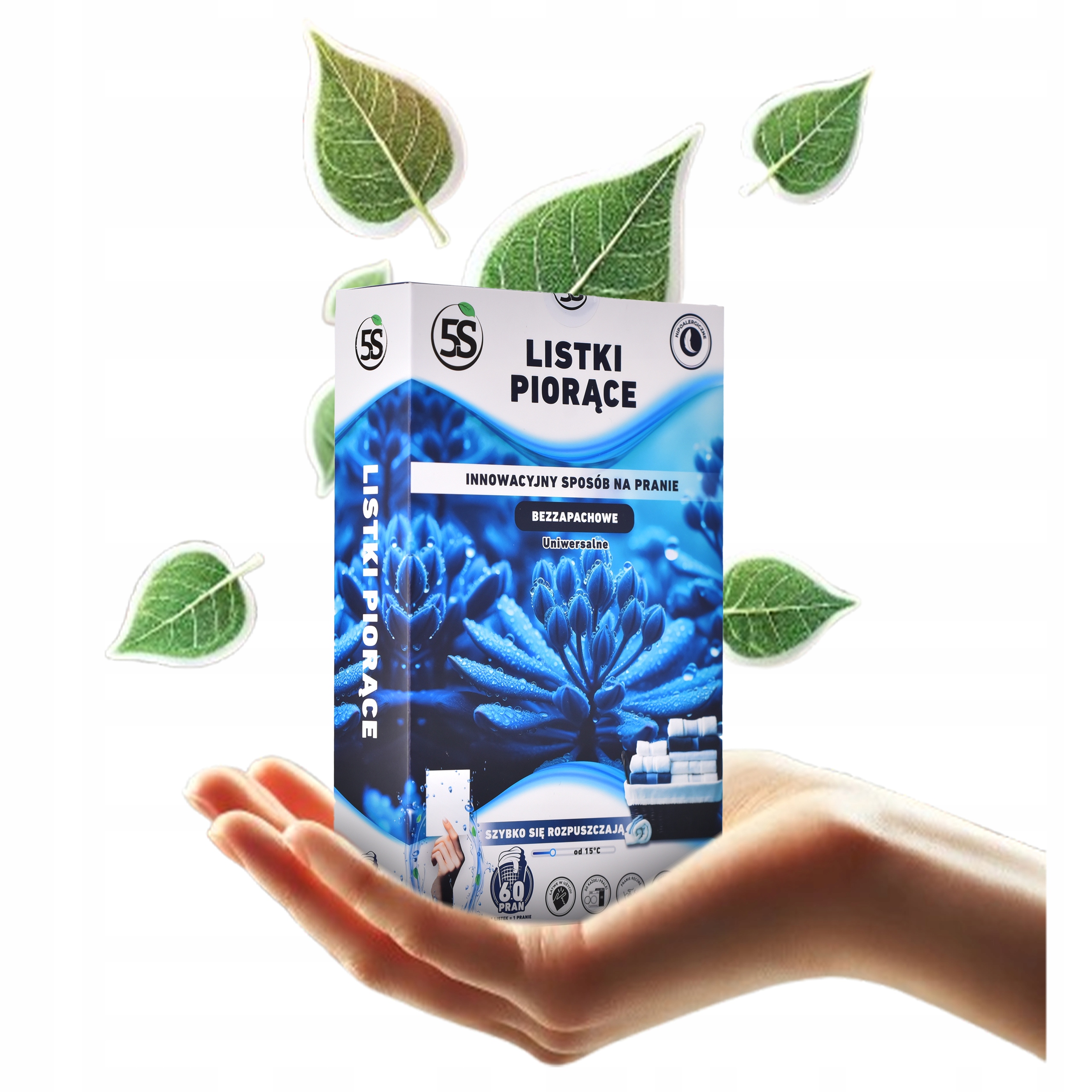 Миття листя 5s без запаху - це інноваційне, екологічне рішення для миття одягу , створеного для максимальної ефективності та делікатності для шкіри. Продукт складається з 60 тонких листків, які легко розчиняються, навіть у холодній воді , завдяки якому вони ідеально підходять для миття як в миття, так і в ручному. Листя без запаху, що робить їх ідеальними для людей з чутливою шкірою або хворими на алергію .