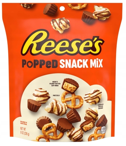 У упаковці ви знайдете знамениті міні -кекси з арахісового масла Риза, шматки Draże Різ, солоний пребл Різ, а також попкорн, покритий шоколадом :)
