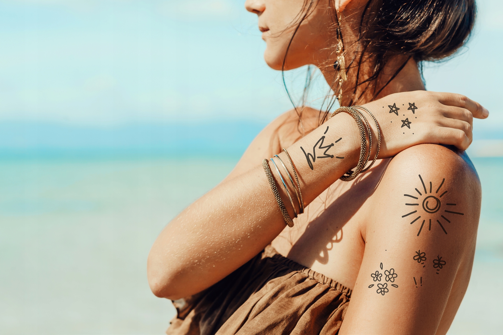 - ➡ Нанесіть татуювання : Виріжте візерунок, видаліть захисну плівку і покладіть її на шкіру.