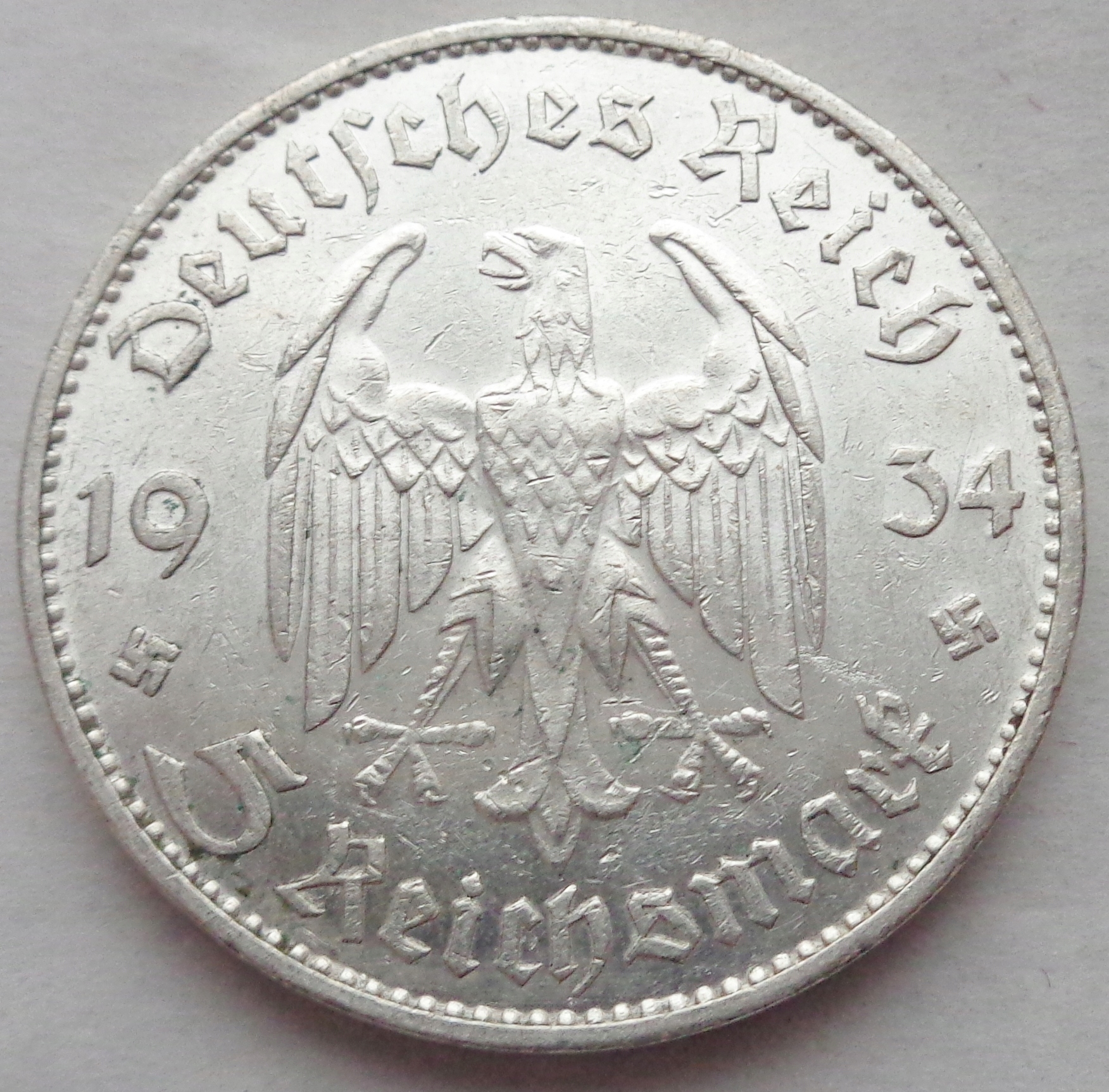 MK - Німеччина - Третій Рейх: 5 марок 1934 G - ЦЕРКВА - срібло