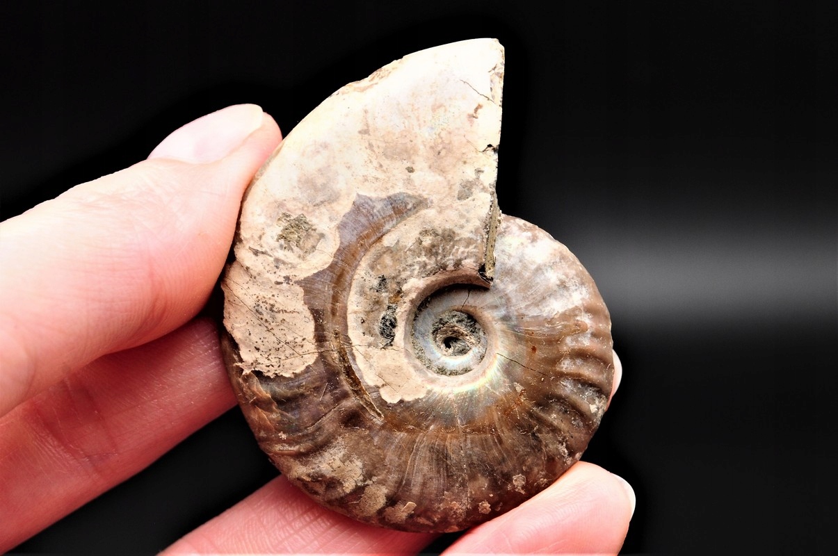 Амоніти (Ammonoidea) - підклас вимерлих головоногих молюсків (Cephalopoda), зазвичай із симетричною плоскоспіральною раковиною. Деякі типи мали незвичайні форми, наприклад, пряма оболонка, вертикально закручена спіраль або спіраль з безконтактними витками. Вони зустрічаються в гірських породах морського походження, що датуються девонським періодом до кінця крейдяного періоду. Деякі окремі камери відкриті та заповнені багатим асортиментом сіро-бежевих і коричневих кристалів кальциту з перегородками між камерами.