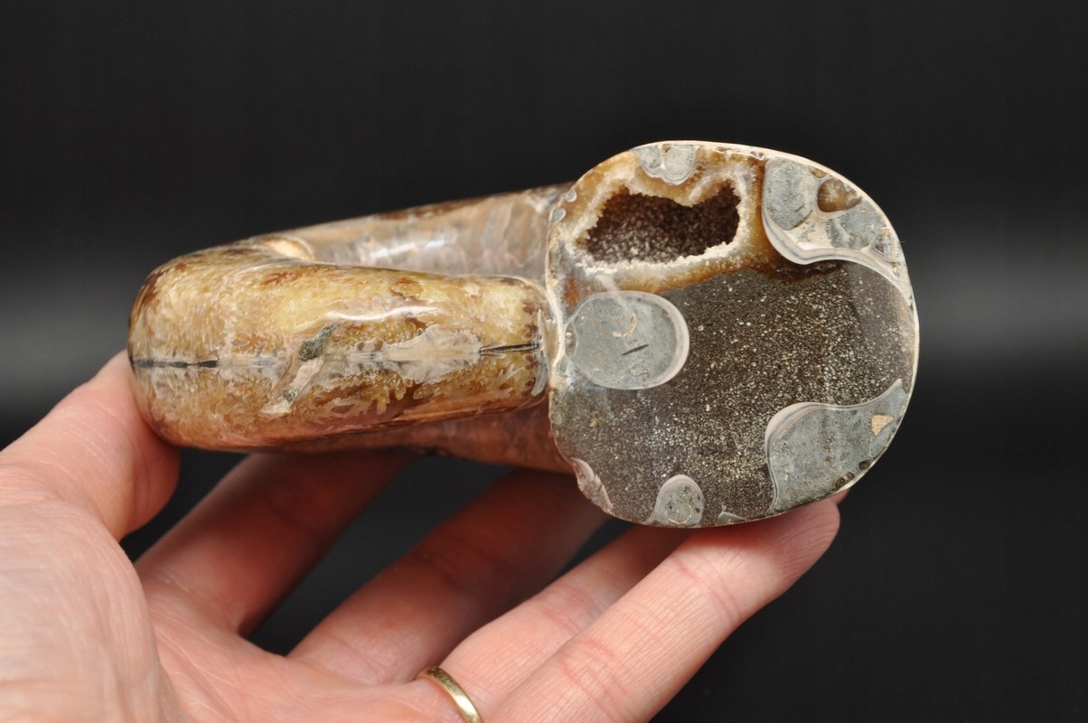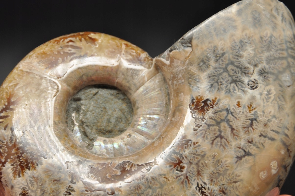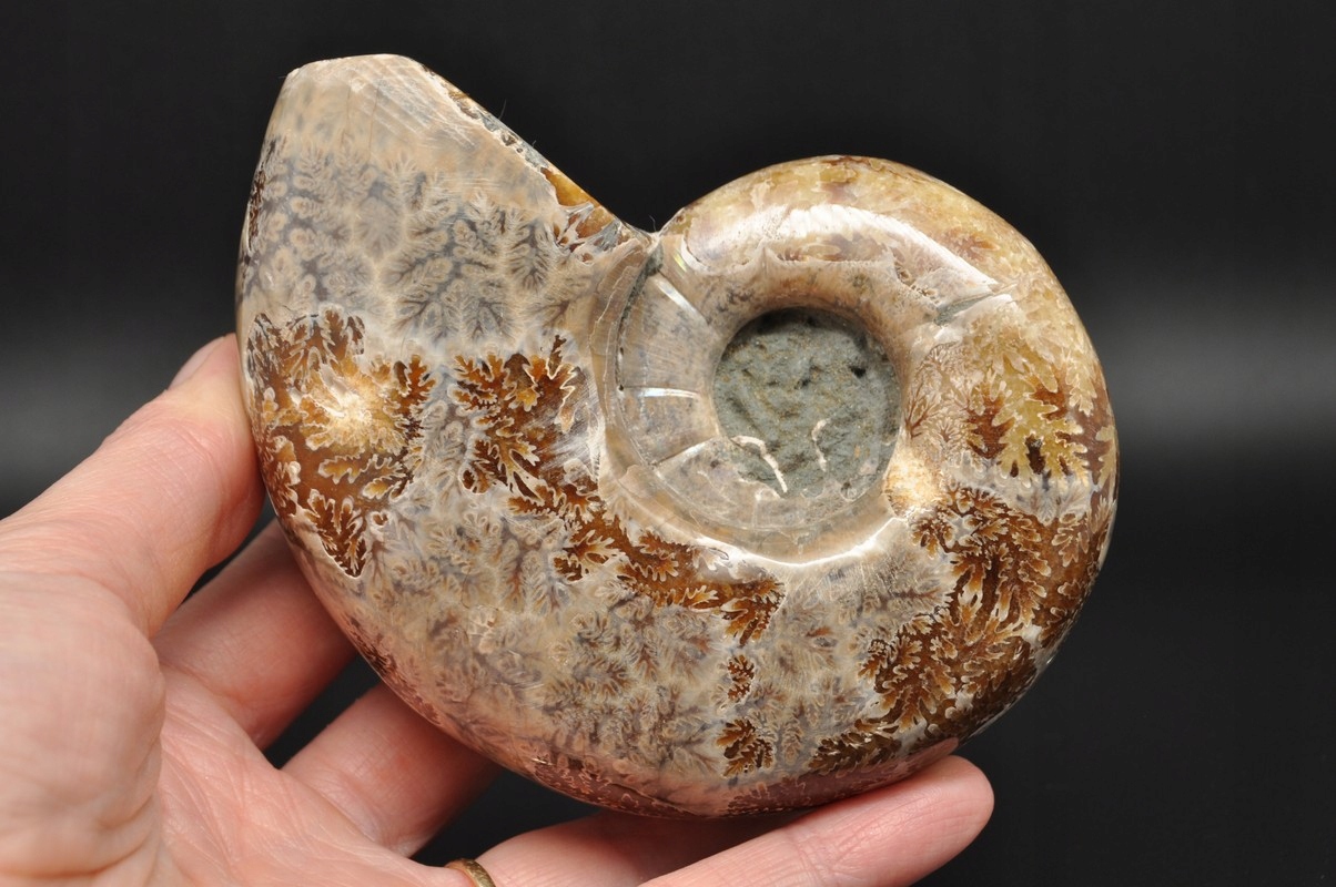 Амоніти (Ammonoidea) - підклас вимерлих головоногих молюсків (Cephalopoda), зазвичай із симетричною плоскоспіральною раковиною. Деякі типи мали незвичайні форми, наприклад, пряма оболонка, вертикально закручена спіраль або спіраль з безконтактними витками. Вони зустрічаються в гірських породах морського походження, що датуються девонським періодом до кінця крейдяного періоду. Деякі окремі камери відкриті та заповнені багатим асортиментом сіро-бежевих і коричневих кристалів кальциту з перегородками між камерами.
