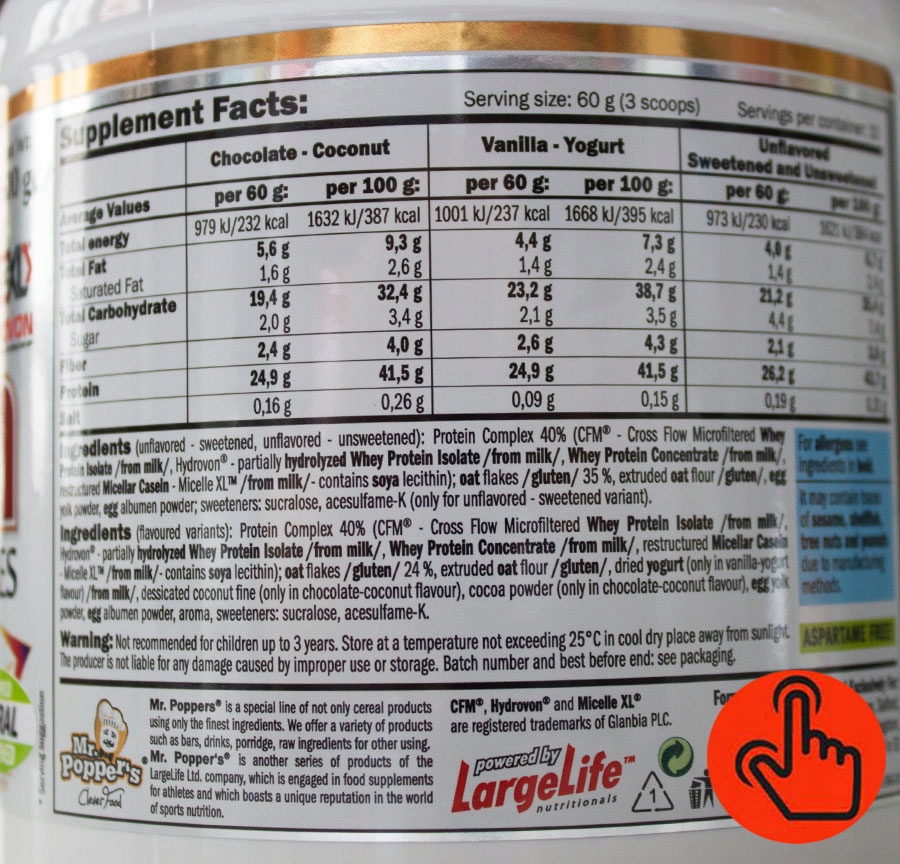 Інгредієнти (зі смаковим варіантом) комплекс протеїнів 40% (CFM® сироватка, протеїновий ізолят / молоко/, Гідровон® гідролізований сироватка,протеїновий ізолят /молоко/,сироватка,протеїновий концентрат /молоко/ модернізовані казеїнові міцели > – XL micelles ™ /молоко/ – містить соєвий лецитин); вівсяні пластівці35%, екструдовані вівсяні пластівці, сушений йогурт/молоко/ (Тільки йогурт зі смаком ванілі, кокосова стружка дрібне (надає смаку шоколаду кокос) какао (з ароматного шоколаду кокос) яєчний жовток – порошок, білок – порошок, ароматизатори, підсолоджувачі: сукралоза, ацесульфам К.