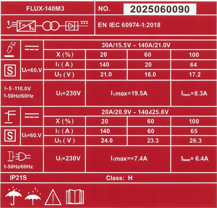 - НОМІНАЛЬНА ВИХІДНА НАПРУГА: 21,0 В FLUX, 25,6 В MMA, 15,6 В TIG