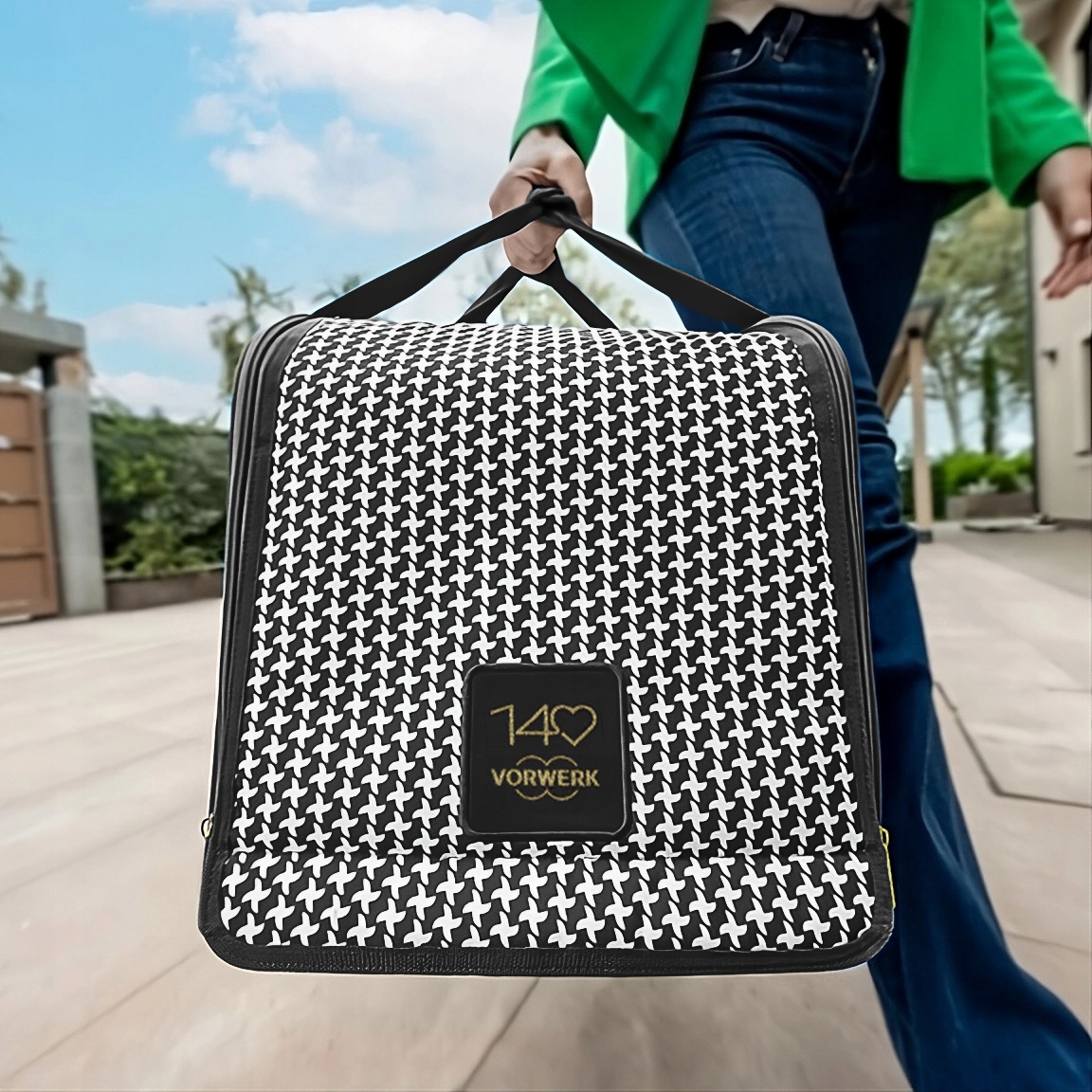 Сумка виготовлена з міцної поліефірної тканини 600D, що робить її стійкою до пошкоджень і зовнішніх умов. Міцні блискавки та додаткові застібки-липучки забезпечують зручність використання та повний захист при перенесенні. Крім того, елегантні ручки на блискавці з золотим гравіюванням і нашивка «140 Vorwerk» надають сумці престижного вигляду.