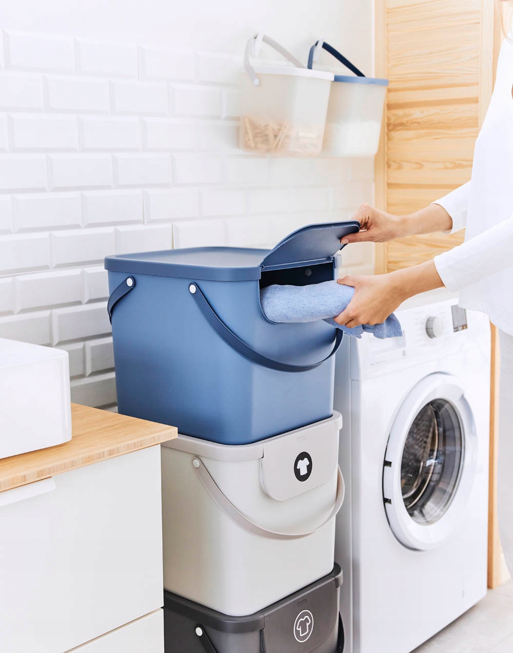 Завдяки продуманій системі ви можете одразу відсортувати брудний одяг перед пранням. Це забезпечують наклейки на передній частині кришки з різноманітними принтами. Просто подивіться на контейнер і ви зрозумієте, куди йде брудний одяг. Індивідуальні ємності мають місткість 40 л. Завдяки чохлу ви можете стерильно зберігати брудний одяг. Продукт Rotho ідеально підходить для кухні, ванної кімнати, офісу тощо.