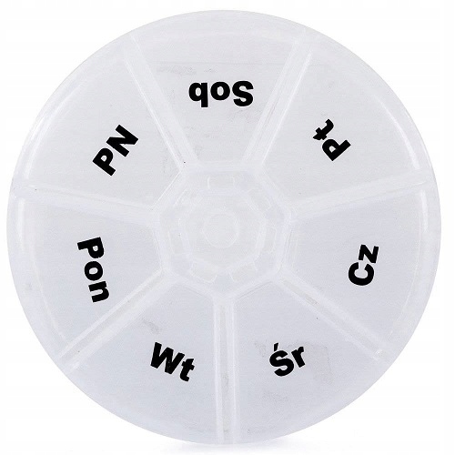 Тижневий контейнер для ліків — це набір із семи пластикових відділень в одній збірній коробці. Ідеальне рішення для приготування ліків на весь тиждень, особливо для хронічно хворих. Замість кількох упаковок ліків ви можете заховати їх усі в невеликий контейнер, який завжди маєте з собою: вдома чи в подорожі. Окремі відділення позначені назвою дня тижня.