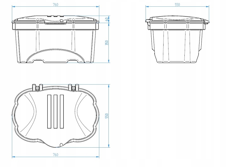 Ємність для піску стійка до пошкоджень і УФ-променів. Зручний для зберігання, пристосований для транспортування за допомогою навантажувача. Спеціальна конструкція петель дозволяє підняти клапан у вертикальне положення. Має кріплення на замок.