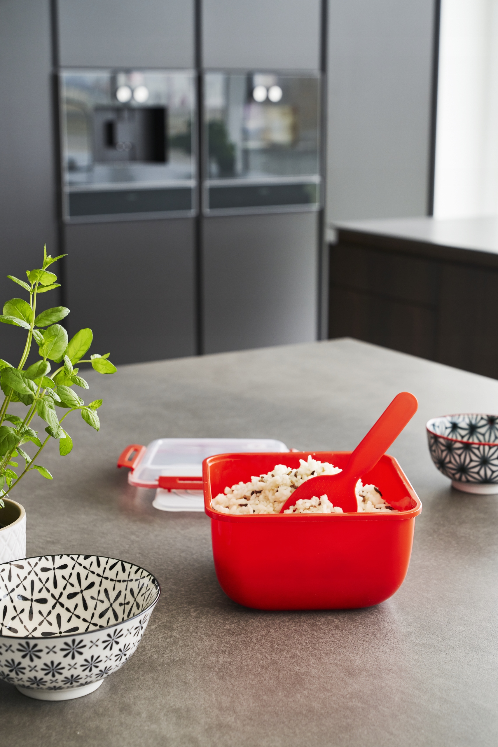 Ємності для мікрохвильової печі серії MEMORY є продукцією відомого швейцарського бренду ROTHO. Показана ємність призначена для приготування рису в мікрохвильовій печі з невеликою кількістю води. Велика ємність дозволяє приготувати велику порцію рису за один раз. Ємність оснащена ложкою та піддоном для прискорення приготування.