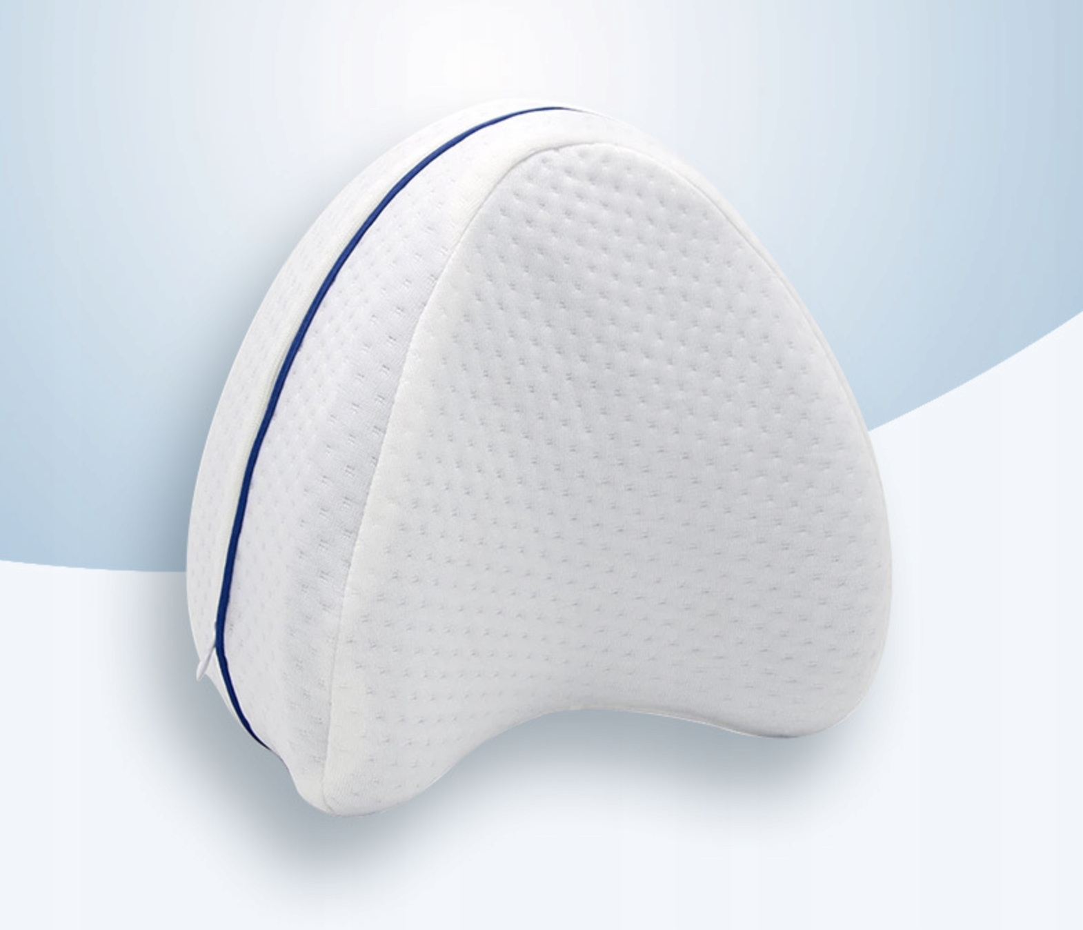 Ортопедична подушка має ергономічну клиноподібну форму, яка допомагає підтримувати природну відстань між колінами під час сну, підтримуючи хребет і тазостегнові суглоби.