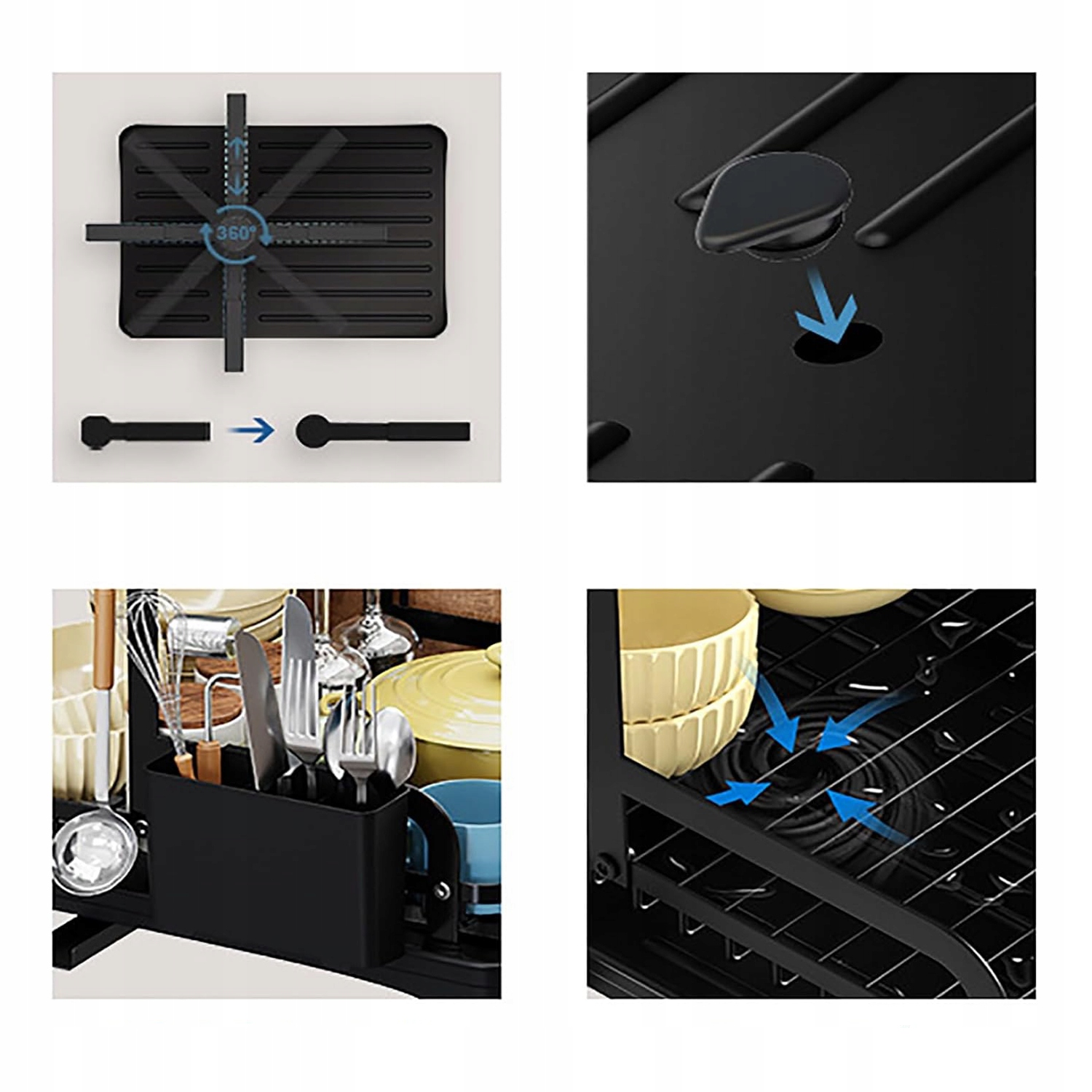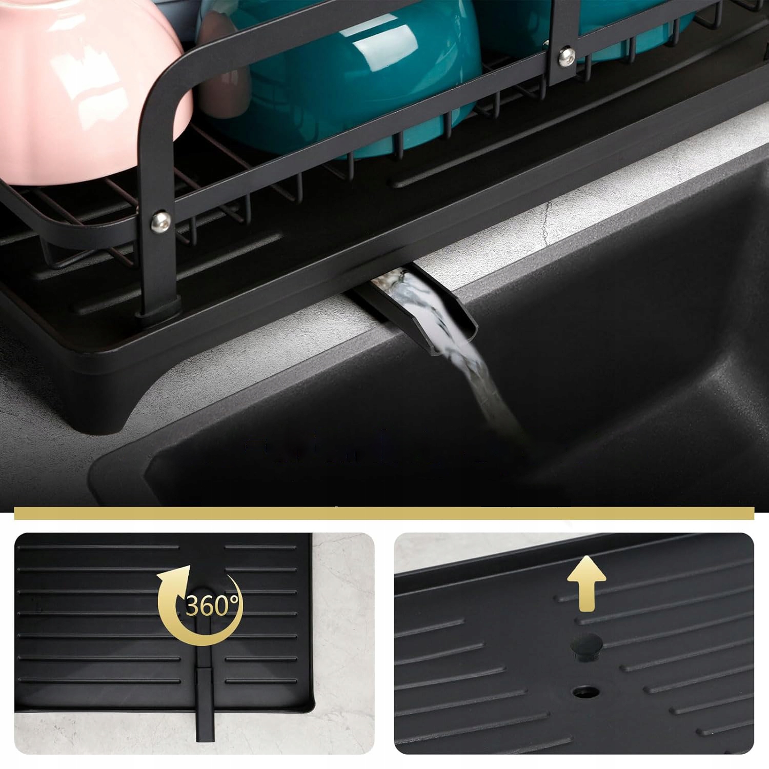 - Висувний поворотний носик можна повертати на 360°, а положення полиці для посуду та раковини можна регулювати, щоб ефективно запобігти накопиченню води.