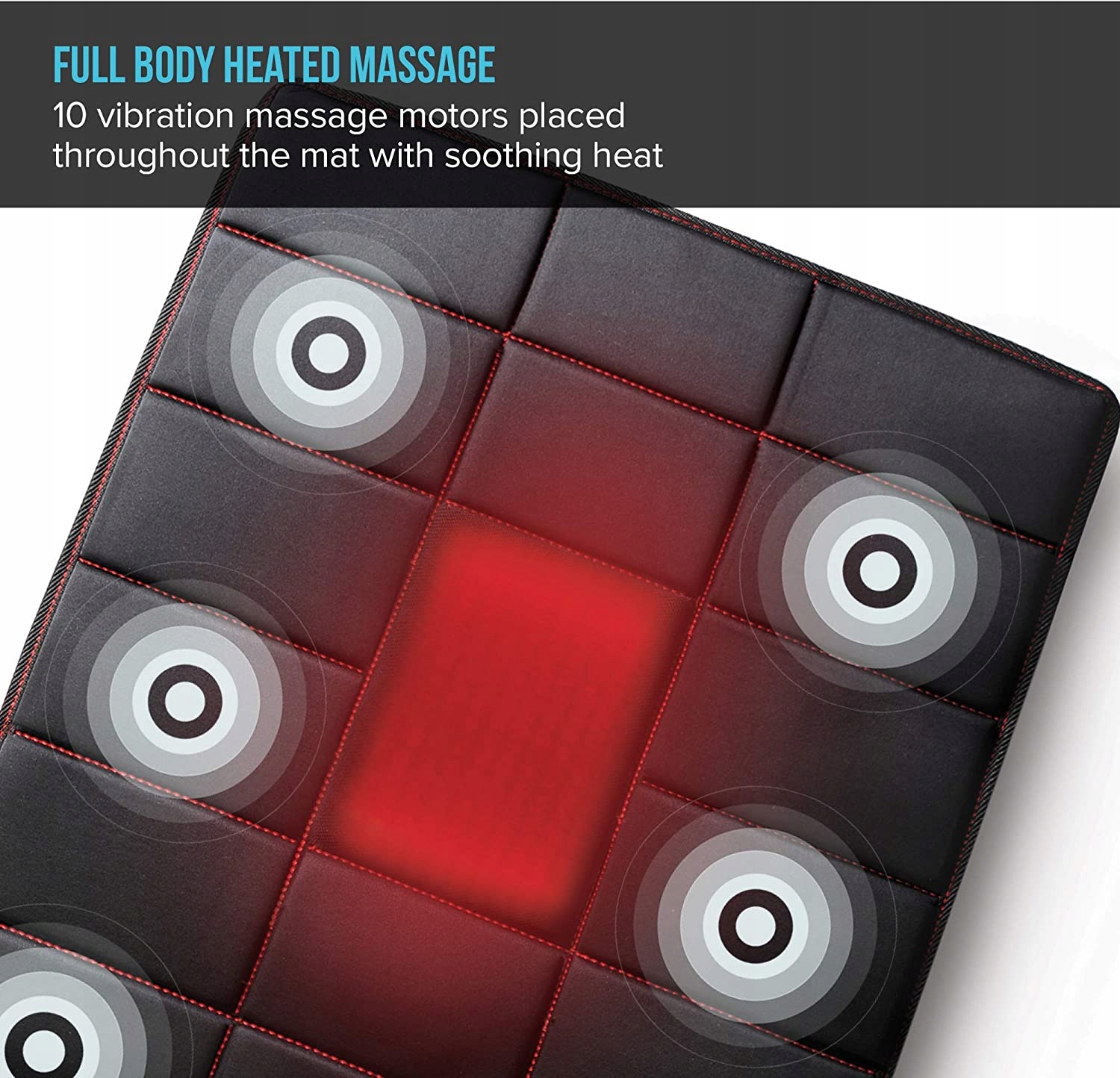 МАСАЖ ВСЕГО ТІЛА З ПІДІГРІВАННЯМ: завдяки вібраційному масажному килимку з підігрівом HoMedics для масажу всього тіла, 10 матових вібраційних масажних двигунів навмисно розміщені по всьому килимку, щоб забезпечити вам максимальне розслаблення.