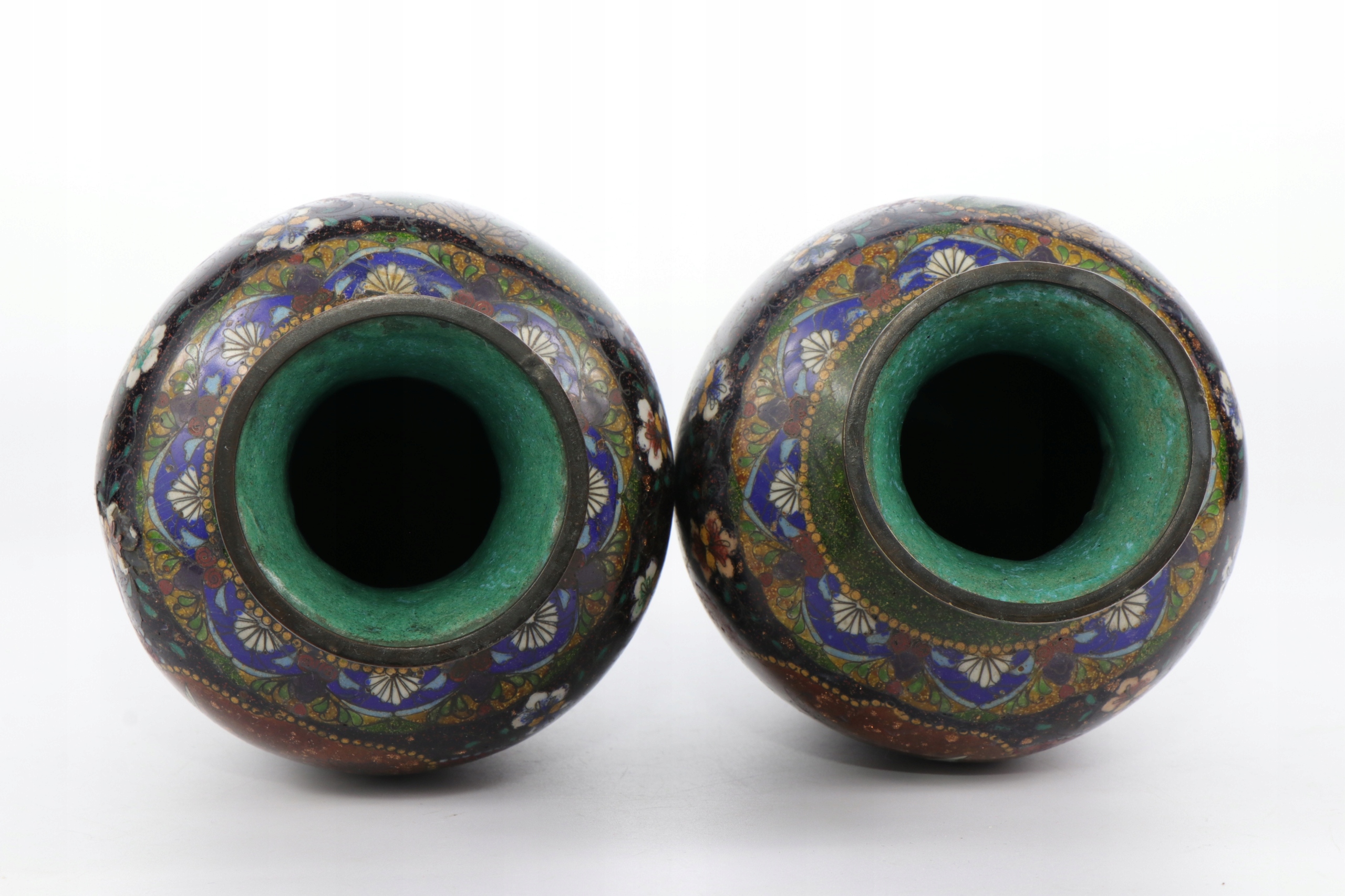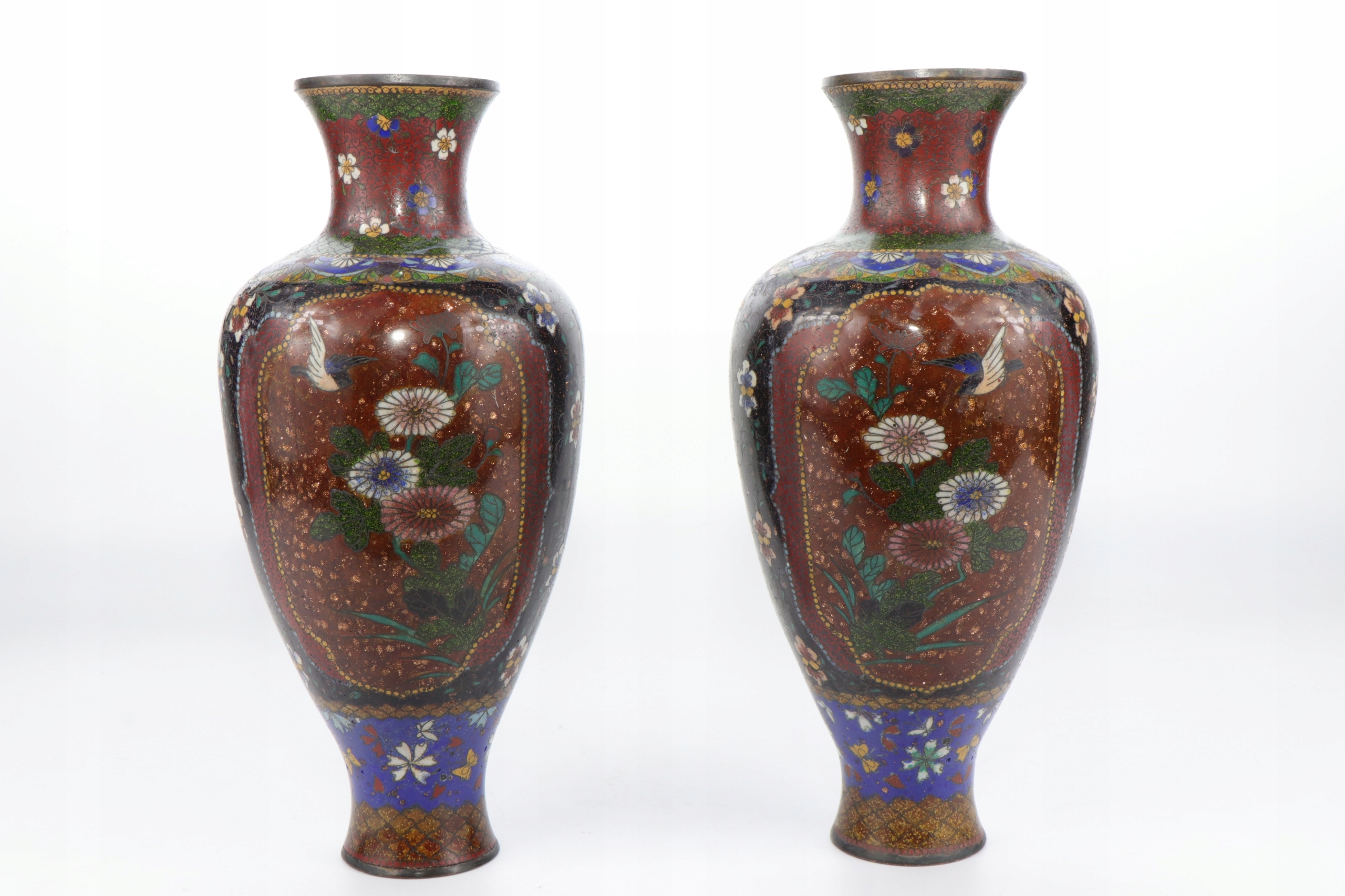 Дві вази, виготовлені з клітинної емалі, з дуже насиченим орнаментом. Вази в характерній формі нижньої частини живота ваз дуже стрункі. Латунь вази з темною старовинною патиною. Предмети хитромудро зроблені, внизу ручного напису в японському довідковому номері.