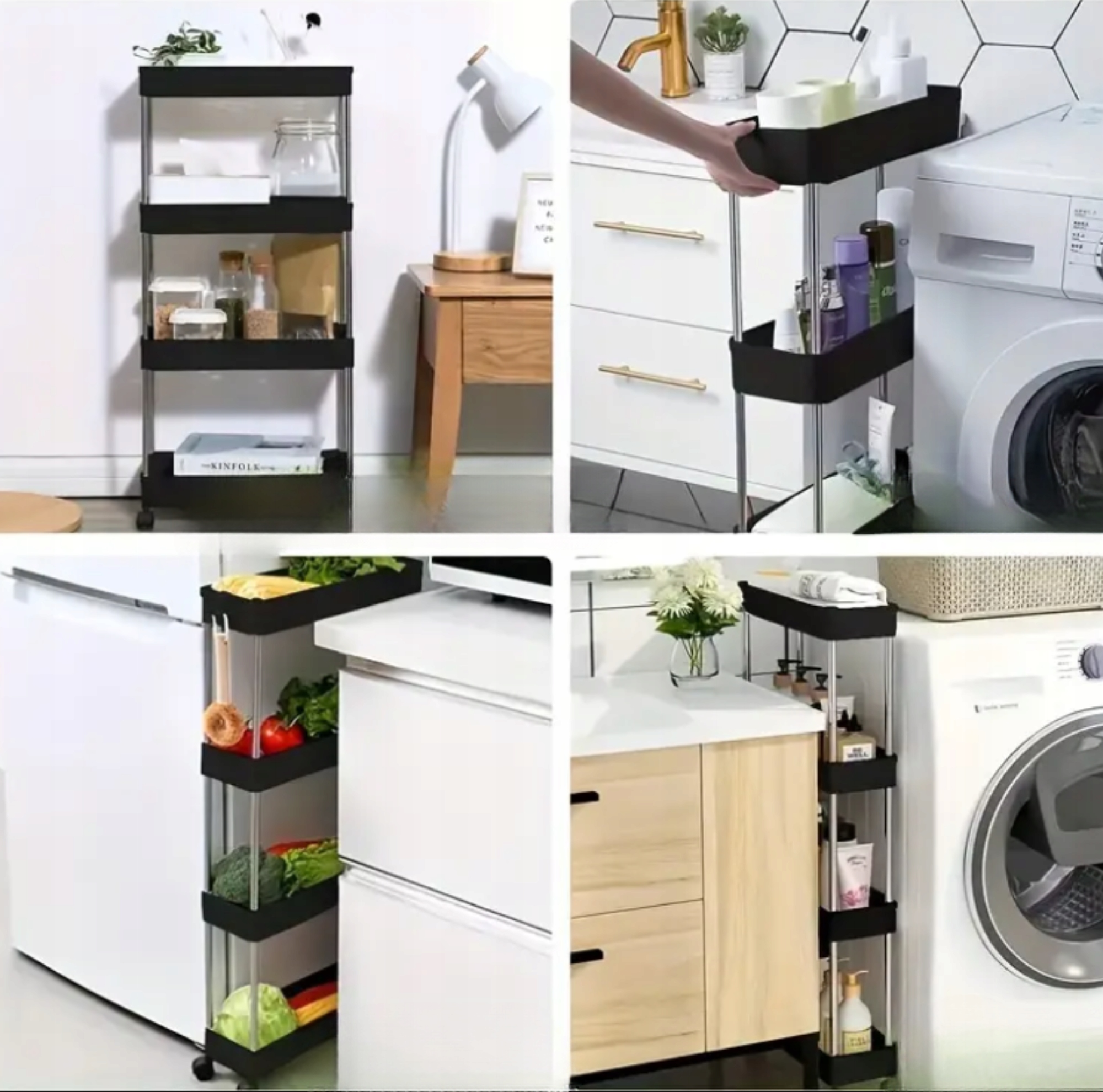 Мобільна полиця чорного кольору на колесах — це просте та практичне доповнення до вашого дому! Це дозволить організувати простір і заощадити місце в шафах. Він підійде в будь-якій кімнаті, де вам потрібен додатковий простір, завдяки своєму естетичному вигляду ви можете розмістити його на кухні, у вітальні, спальні або ванній кімнаті, він також ідеально підходить для салону краси. Відкриті полиці дадуть вам швидкий доступ до необхідних речей, а коліщатка дозволять легко змінити їх місце, без зайвого застосування сили!