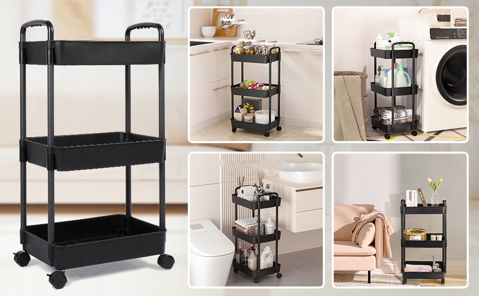 - 3-рівневий візок для покупок оснащено колесами, що обертаються на 360° (2 із фіксацією), які можна перемістити в будь-який куток будинку, щоб зберігати речі або тримати візок на місці для безпечного використання.