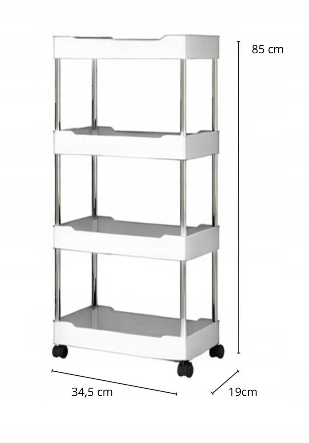 Мобільна полиця білого кольору на колесах — це просте та практичне доповнення до вашого дому! Це дозволить організувати простір і заощадити місце в шафах. Він підійде в будь-якій кімнаті, де вам потрібен додатковий простір, завдяки своєму естетичному вигляду ви можете розмістити його на кухні, у вітальні, спальні або ванній кімнаті, він також ідеально підходить для салону краси. Відкриті полиці дадуть вам швидкий доступ до необхідних речей, а коліщатка дозволять легко змінити їх місце, без зайвого застосування сили!
