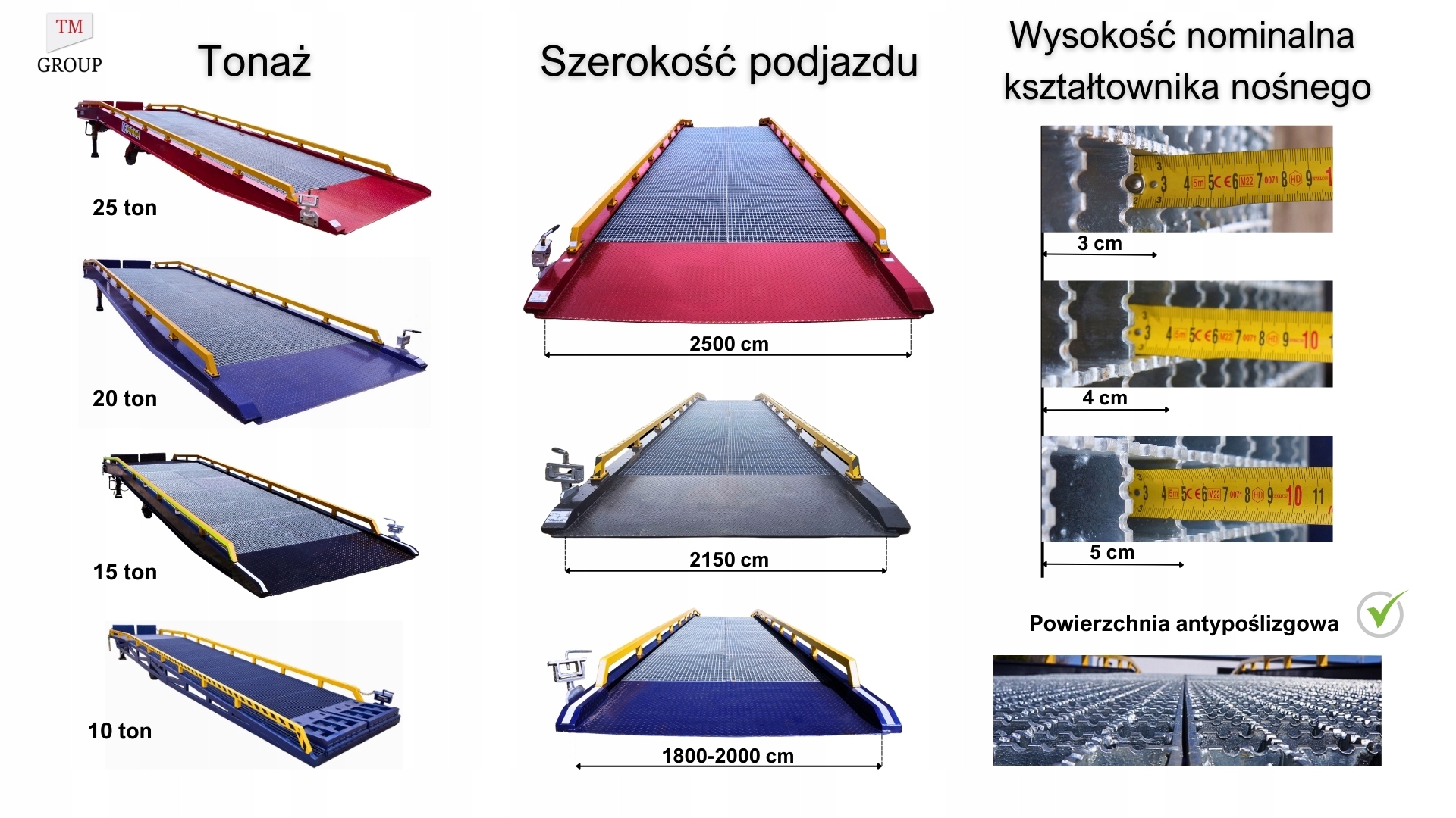 Враховуючи інтенсивність навантажувальних робіт, тип навантажувальної техніки та загальну тоннажність допустимого вантажу, ми підготували лінійку стандартних навантажувальних рамп вантажопідйомністю від 6 до 80 тонн. У більшості випадків клієнт може легко знайти пандус, який ідеально підходить для його потреб серед запропонованого обладнання.