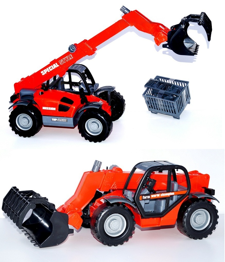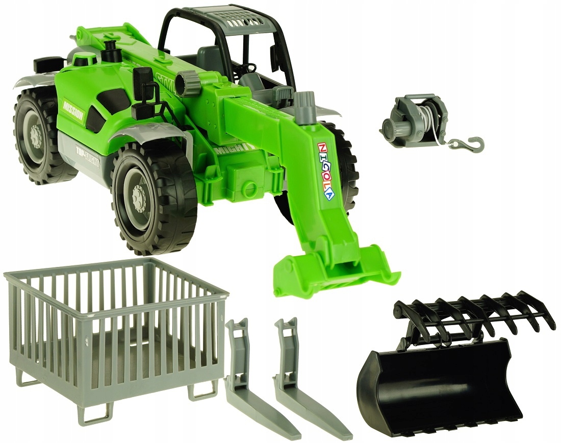 Manitou з жаткою, вилами для сіна та візками. Навантажувач, гак з тросом як кран, наконечник, який служить