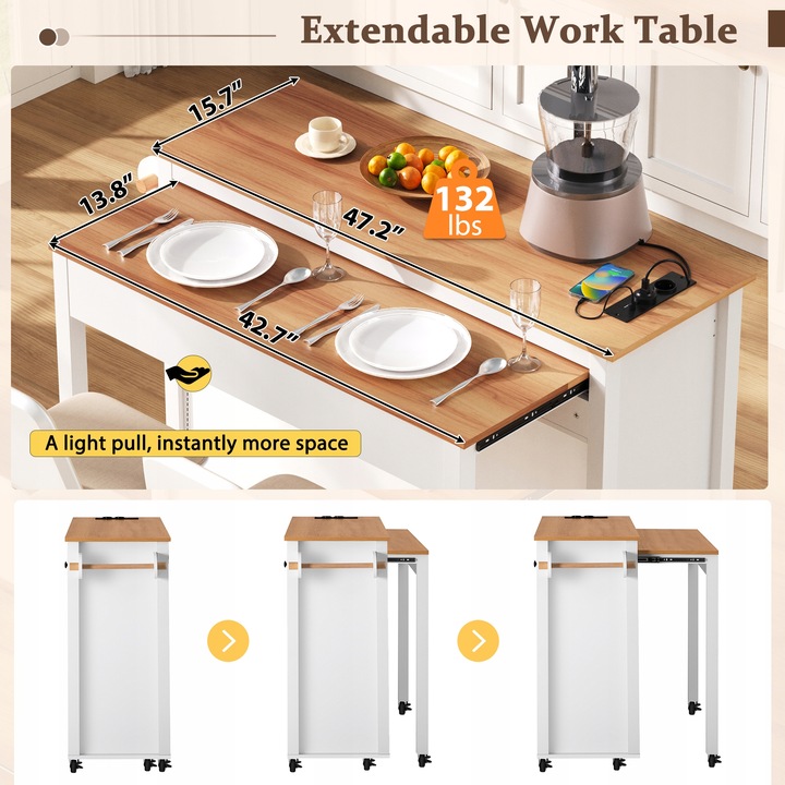 2. Розсувна робоча поверхня та вбудований зарядний пристрій: розширте свій робочий простір без особливих зусиль за допомогою розширення, яке збільшує ширину з 40 см до 75 см і витримує до 60 кг. Вбудована зарядна станція містить 2 розетки, 1 порт USB і 1 порт типу C, тому ваші прилади та пристрої живляться під час готування.