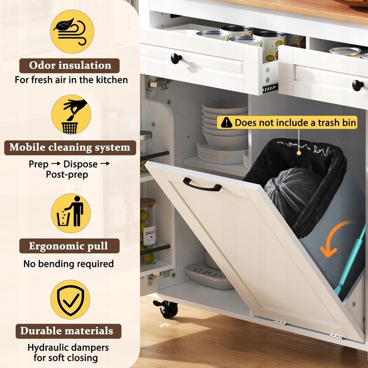 1. Розумне зберігання та компактний дизайн: цей сучасний кухонний острів поєднує європейську естетику з практичними рішеннями для зберігання. Він має дверцята у стилі холодильника, регульовані полиці, відкрите сховище зі знімним тримачем для рушників і окреме відділення для сміттєвого бака, що забезпечує максимальну ефективність навіть на компактних кухнях.