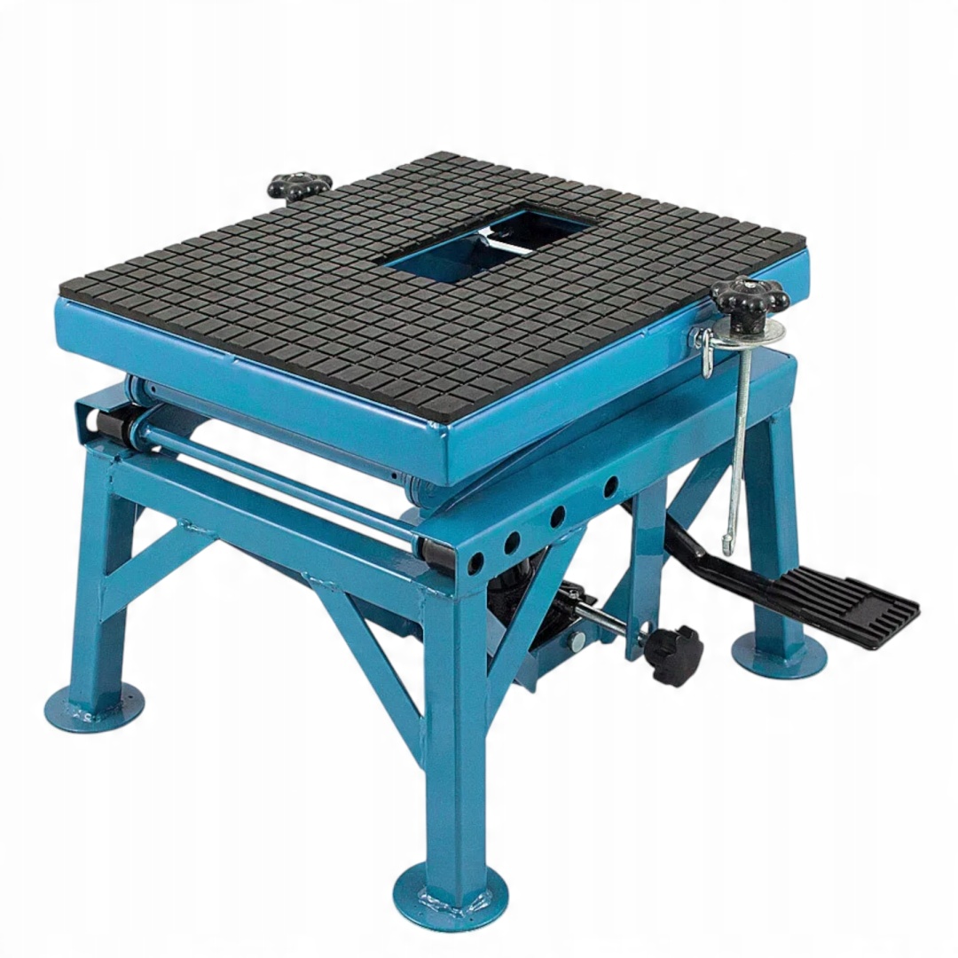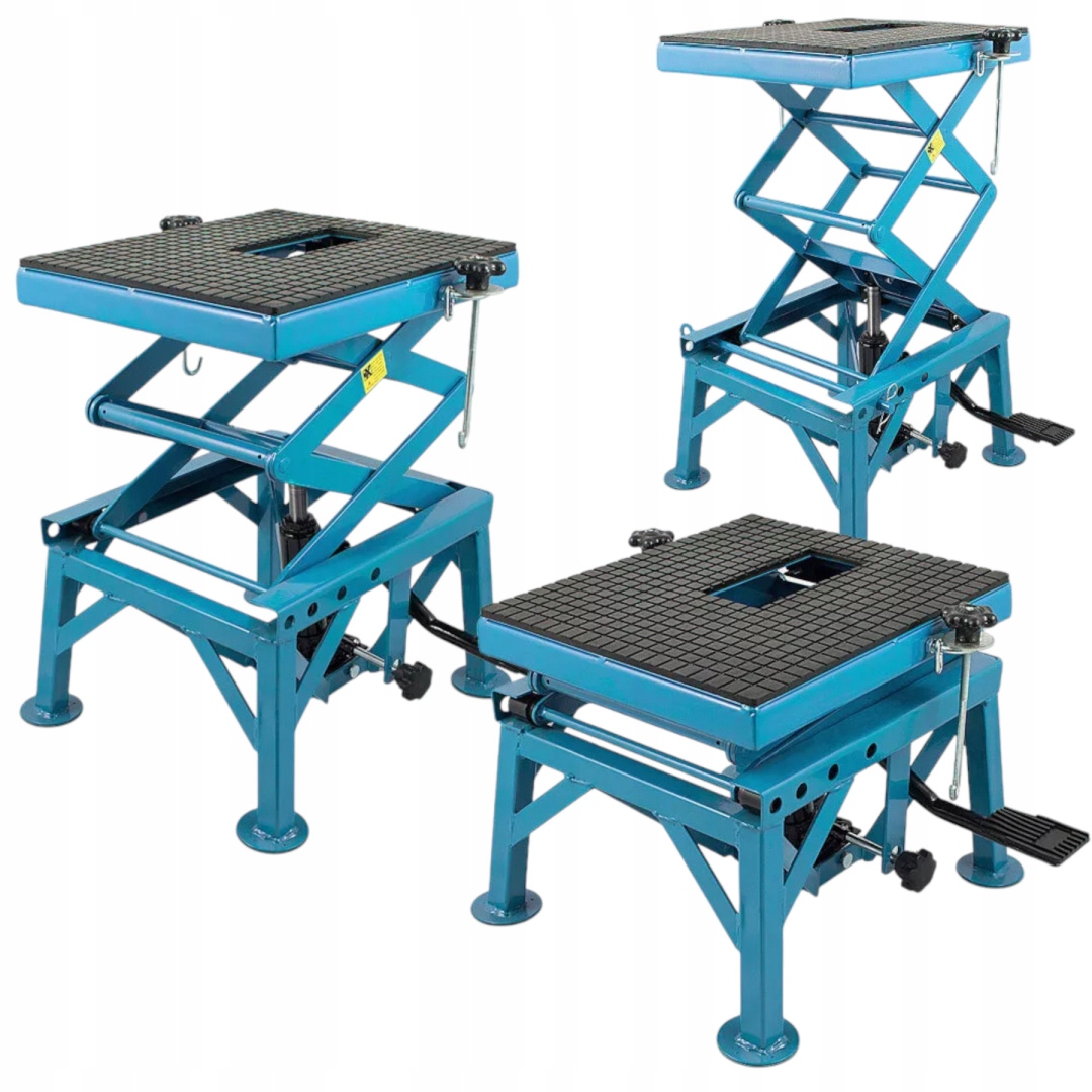 Гідравлічний ліфт з мотоциклом з регулюванням висоти на трьох етапах (46 см, 76 см, 87 см). Оснащений гумовою платформою, гальмівними колесами та захистом, ідеально підходить для семінарів та домашнього використання