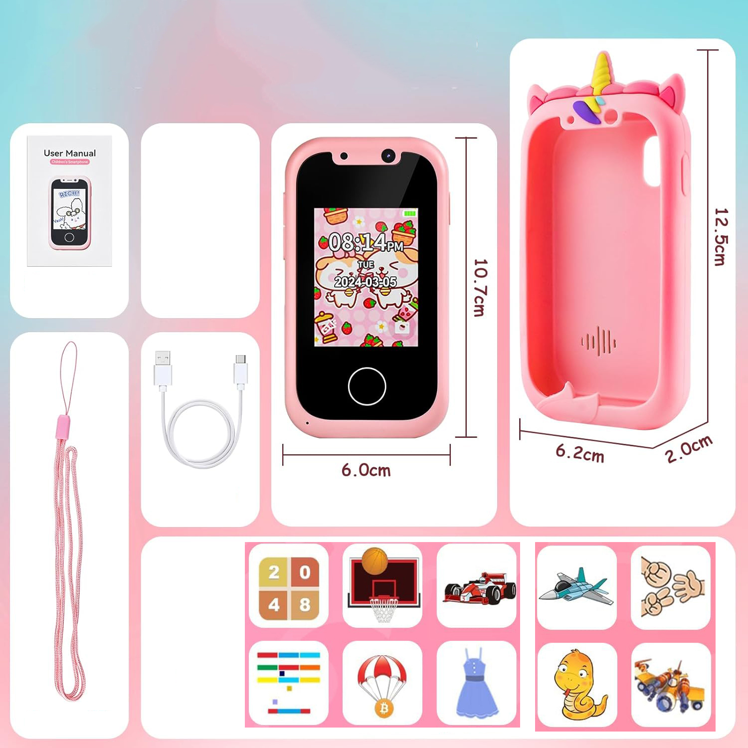 🩷 Багатофункціональність:Дитячий мобільний телефон Unicorn оснащений 8 вбудованими веселими іграми, які збагачують щоденні розваги дітей і можуть тренувати їхнє логічне мислення, реакцію та координацію рук і очей. 12 налаштувань життєвого плану допомагають дітям виробити звички здорового життя; функція географічної таблички дозволяє дітям проникнути у світ; Завдяки функції дошки для малювання діти можуть вільно грати та бути творчими хочу.
