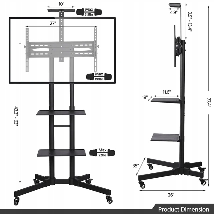 Підставка під телевізор витримує навантаження до 50 кг і регулюється по висоті від 110 см до 160 см. Тримач сумісний з екранами з діагоналлю від 32 до 75 дюймів і максимальним розміром монтажних отворів VESA 600 x 400 мм. Крім того, наша підставка під телевізор ідеально підходить для різних середовищ: офісів, будинків, шкіл, конференц-залів, готелів, аеропортів, холів, лікарень, лабораторій, церков, торгових центрів, відеоконференцій тощо.