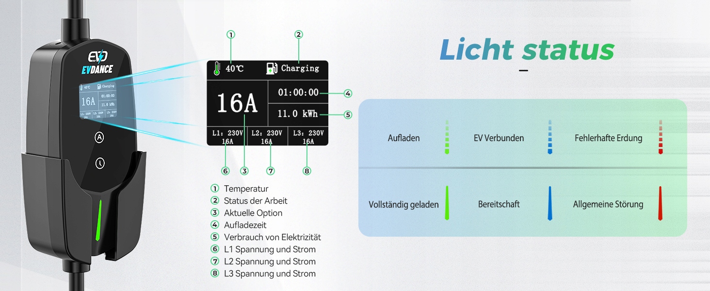 - Мобільне стінове зарядне зарядки 11 кВт - не потребує встановлення, підключеного до існуючого плагіна CEE з максимальною потужністю 11 кВт, простим та економічним. Він працює як стаціонарний стіновий зарядний пристрій вдома або на роботі, і як портативний зарядний пристрій на подорожі.