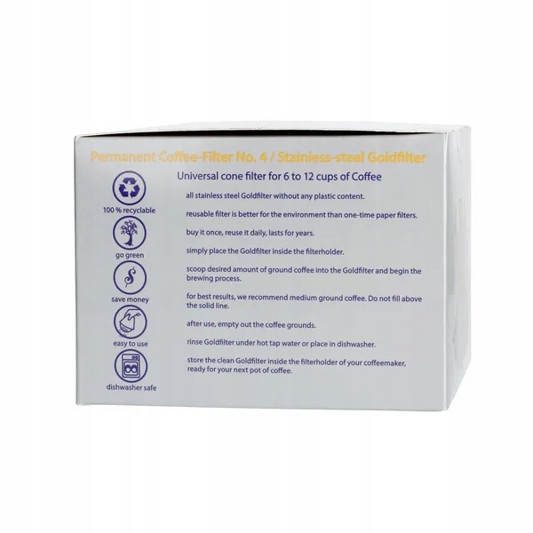 Багаторазовий фільтр розміром 1х4, призначений для кавомашин з фільтром Moccamaster. Виготовлений із пластику та нержавіючої сталі, покритої 23-каратним золотом. Більше ніяких проблем із покупкою одноразових фільтрів!