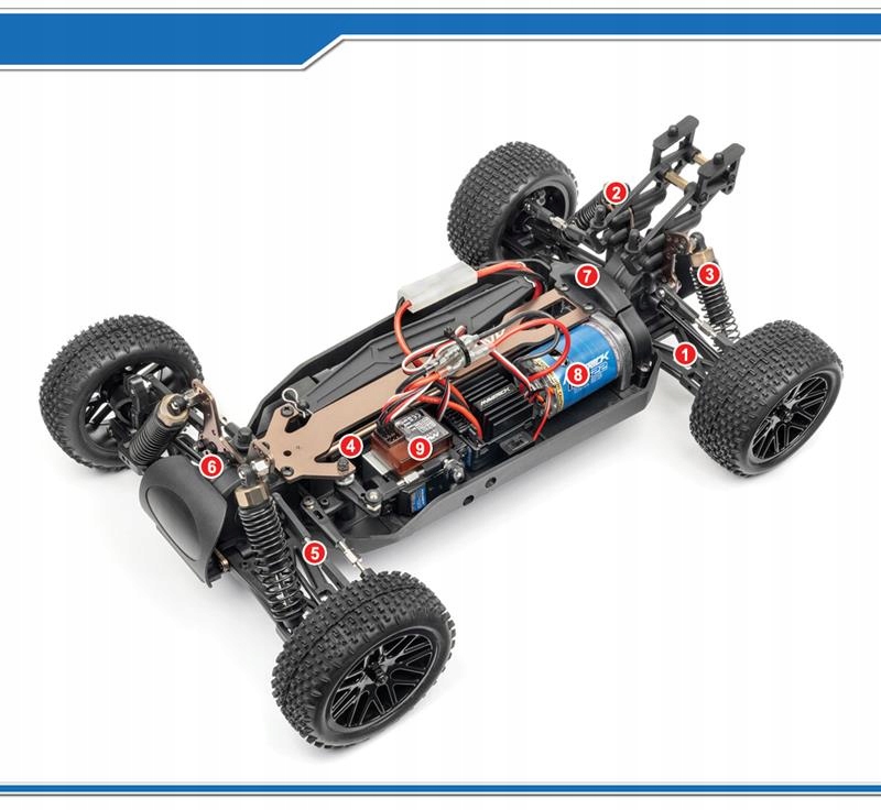 Стандартно модель оснащена щітковим двигуном класу 540, який дозволяє їй розвивати швидкість приблизно 40 км/год. Такого поєднання цілком достатньо для початківця моделіста. Однак, якщо ви любите модифікації та більш екстремальний досвід, ви можете збільшити швидкість, використовуючи батарею вищої напруги - LiPo.