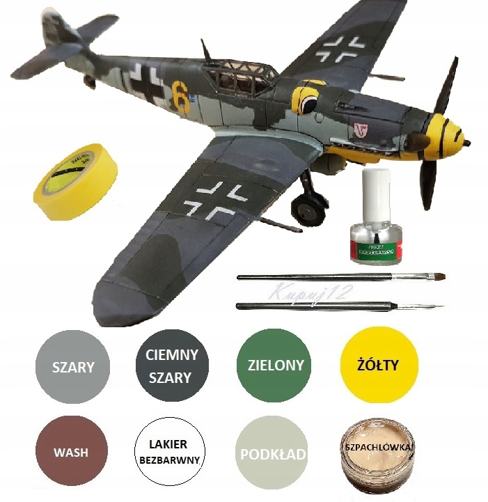 МОДЕЛЬ ЛІТАКА MESSERSCHMITT 1/72 + ФАРБИ + ЛАК + ГРУНТОВКА + ФУНКЦІОНАЛЬНИЙ ОДЯГ + КЛЕЙ + ПЕНЗЛИКИ x 2 + ШПАТКУВКА + МОДЕЛЮВАЛЬНА СТРІЧКА