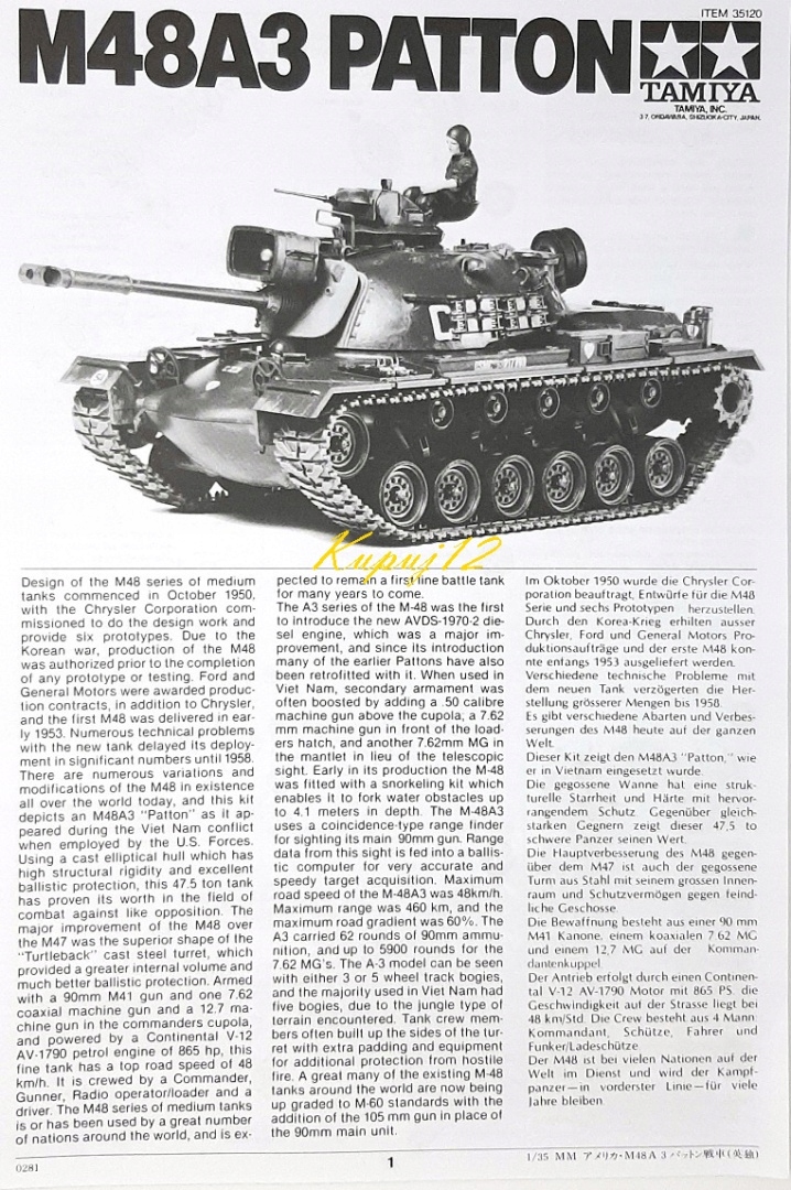 Модель American Tank M48A3 Patton + Paints, фундамент, лак, масштаб 1:35