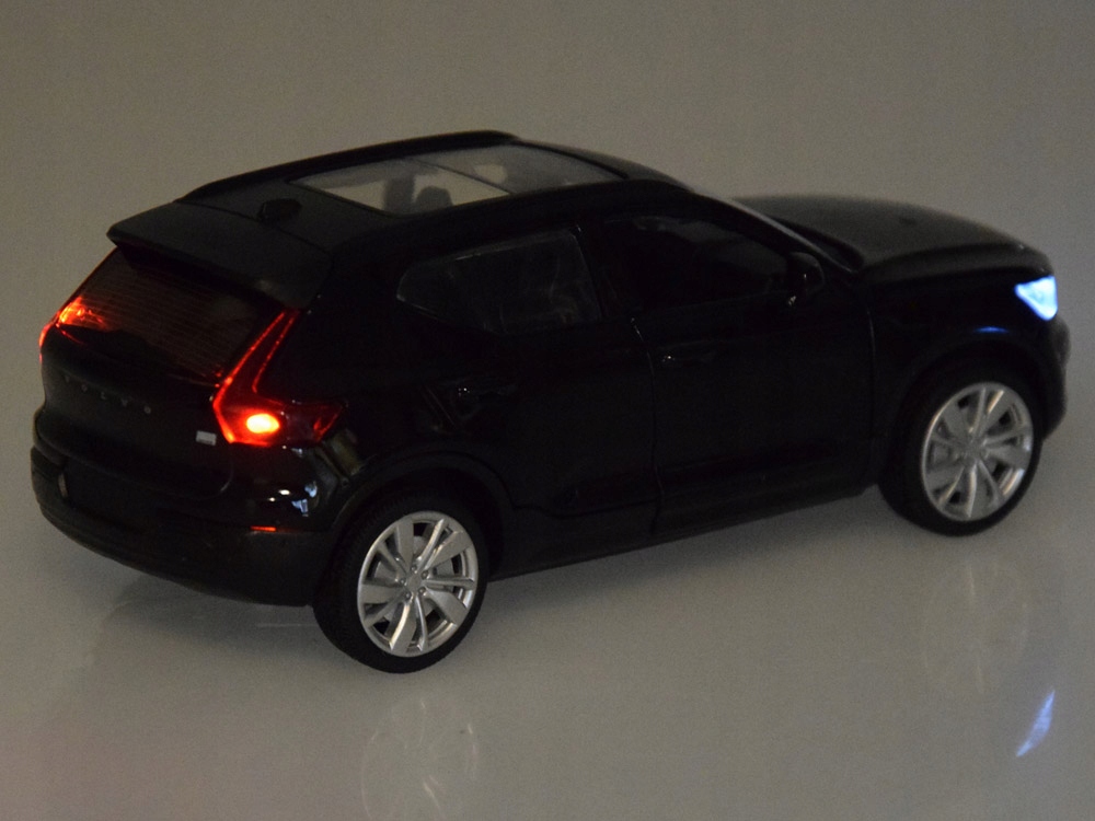Коли ви відкриваєте двері Volvo XC40, ви чуєте звук автомобіля, що відкривається ключем. Притискання автомобіля до землі активує звук запуску та роботи двигуна. Звукові ефекти супроводжуються підсвічуванням спереду та ззаду автомобіля. Весь кузов автомобіля зроблений з металу, колеса – гумові, а шасі – з пластику.