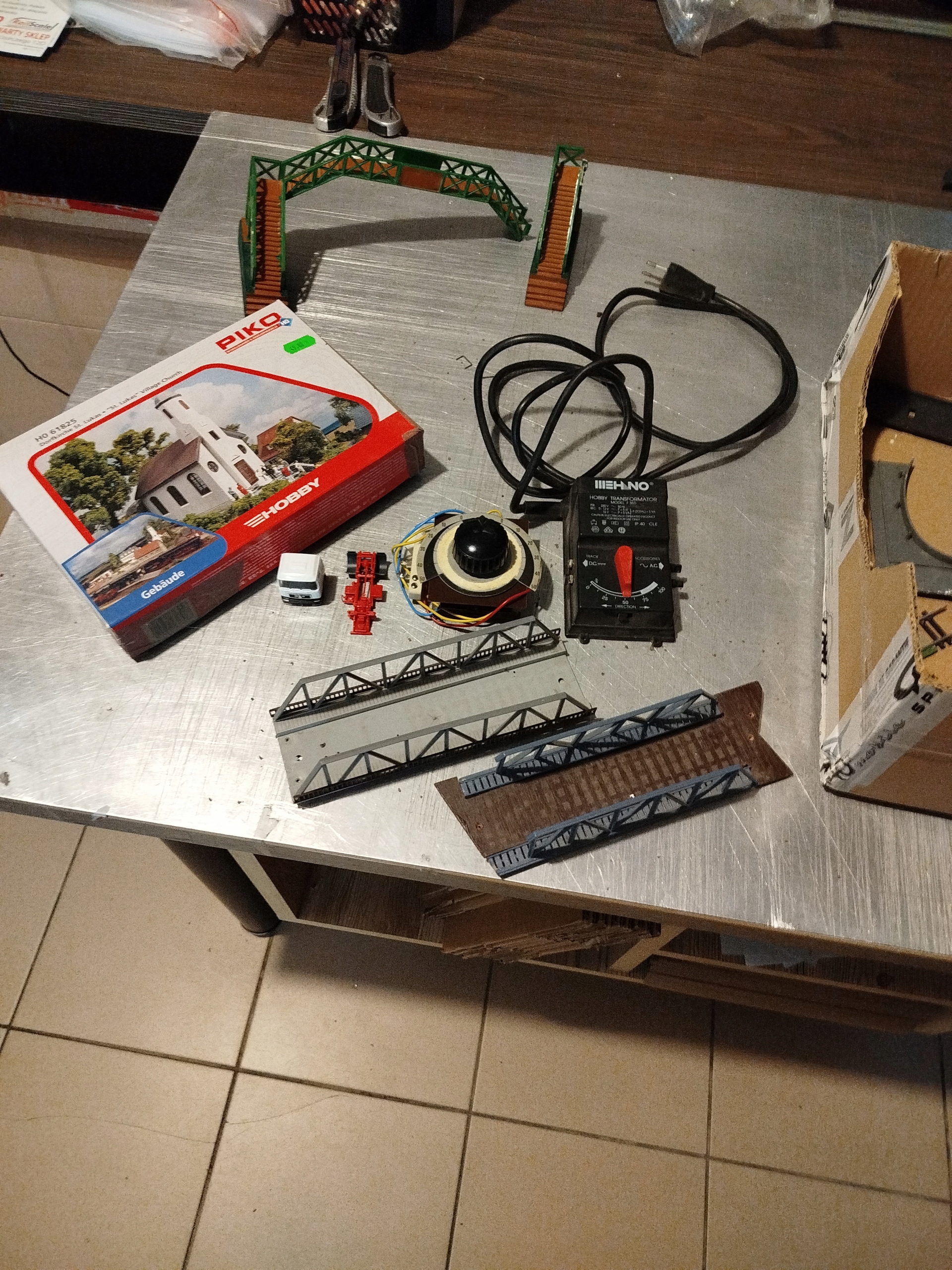 - Набір включає те, що є на знімках, у трав’яних килимках, доріжках старого типу H0, пошкодженими елементами, деревами, пошкодженим фургоном. Електричні елементи, невідомо, чи він функціональний.