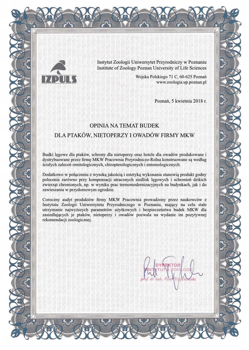 Тісна співпраця з Інститутом зоології Університету природничих наук у Познані робить нашу продукцію оптимально адаптованою до умов гніздування тварин, які їх мешкають, що призводить до дуже високого рівня розселення.