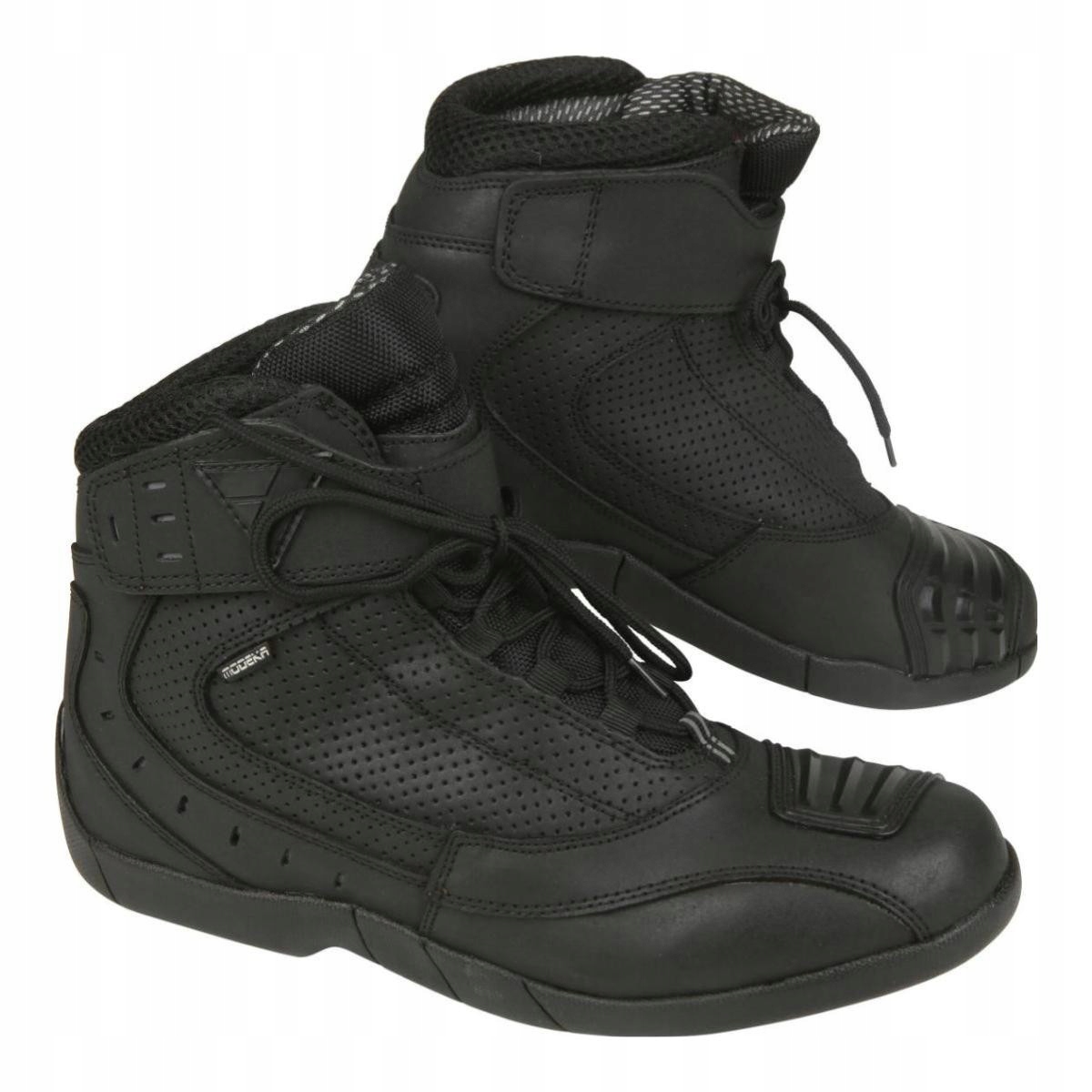 Короткі взуття для мотоциклів у спортивному стилі. Виготовлений з поліуретану, покритого високоякісною шкірою. Вони оснащені захисниками щиколотки, підкріпленням важеля передачі та перфорованими шкірою для ефективної вентиляції.