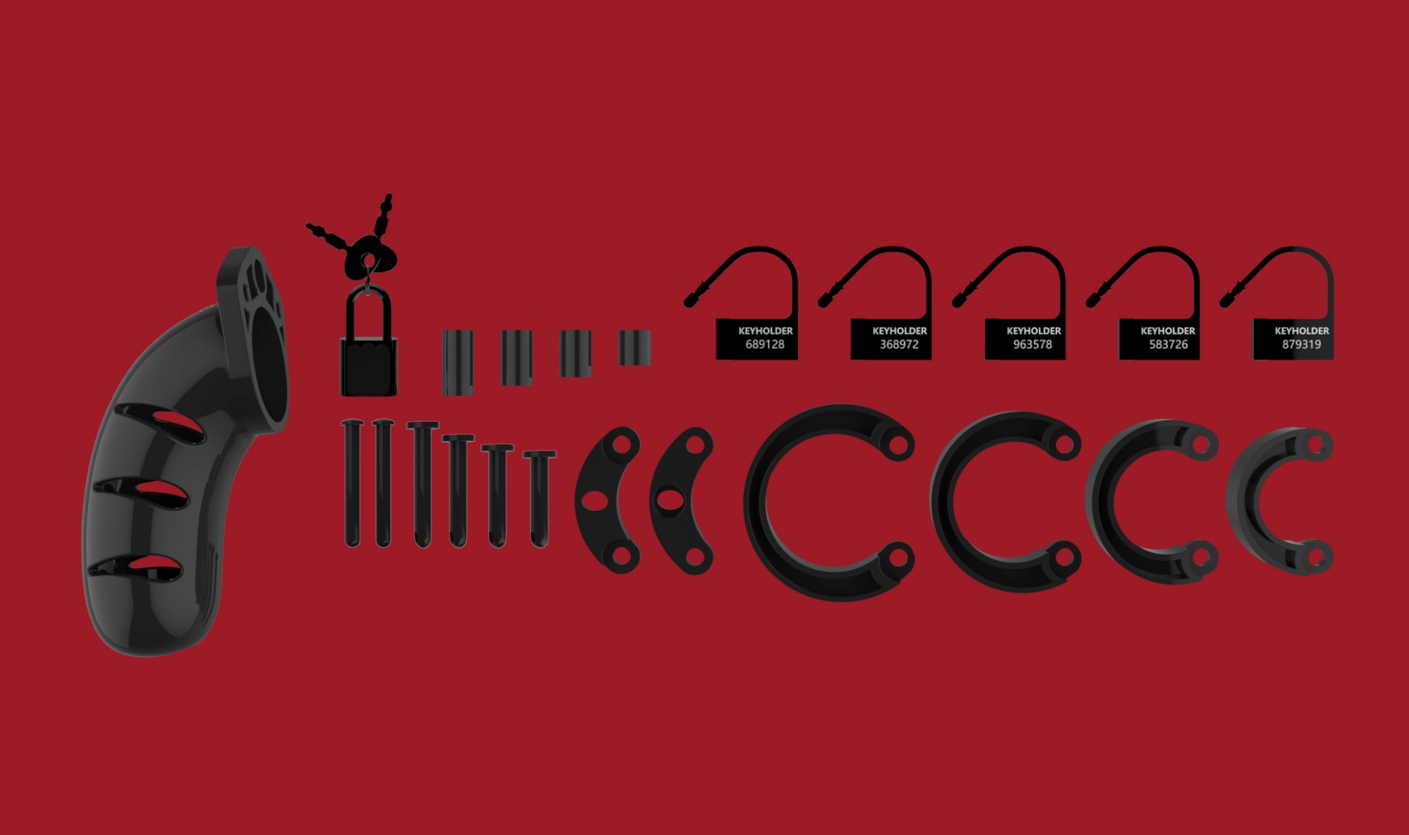 вміст упаковки: 4 кільця розміром 45/50/55 та 60 мм та 6 замків (1 металеві та 5 пластикових смуг).
