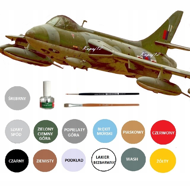 МОДЕЛЬ ЛІТАКА HAWKER HUNTER F Mk6 + СПЕЦІАЛІЗОВАНІ ФАРБИ + ГРУНТОВКА + ПРОЗОРНЕ ПОКРИТТЯ + WASCH для нанесення бруду + КЛЕЙ + 2 плоскі та круглі вузькі ПЕНЗЛИКИ.