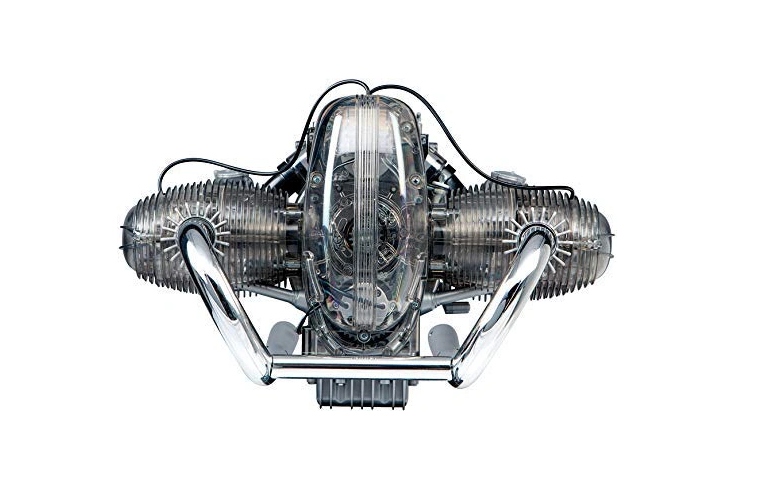 Прозора робоча модель — абсолютна родзинка для всіх шанувальників техніки та мотоциклів. З приблизно 200 пластикових деталей ви можете зібрати власний опозитний двигун мотоцикла за три-чотири години. Склеювання не потрібно, тому приємне моделювання гарантовано! Ця модель дійсно працює: ви побачите, як колінчастий вал, циліндр і поршень взаємодіють у реальному часі, як у великому прототипі, а іскри в циліндрах імітуються світлодіодами. Завдяки прозорому дизайну ви можете зрозуміти структуру, роботу та механіку двоциліндрового двигуна в масштабі 1:2 спочатку під час складання, а потім зовні під час руху. І найголовніше, що вперше в моделі з'явилася детальна і перемикається 5-ступінчаста коробка передач. Крім того, в модель входить звуковий модуль із записом звуку оригінального двигуна. Натиснувши одну кнопку, ви можете оживити детальну копію двигуна опозитного мотоцикла. Якщо ви любите мотоцикли, вам сподобається цей набір!