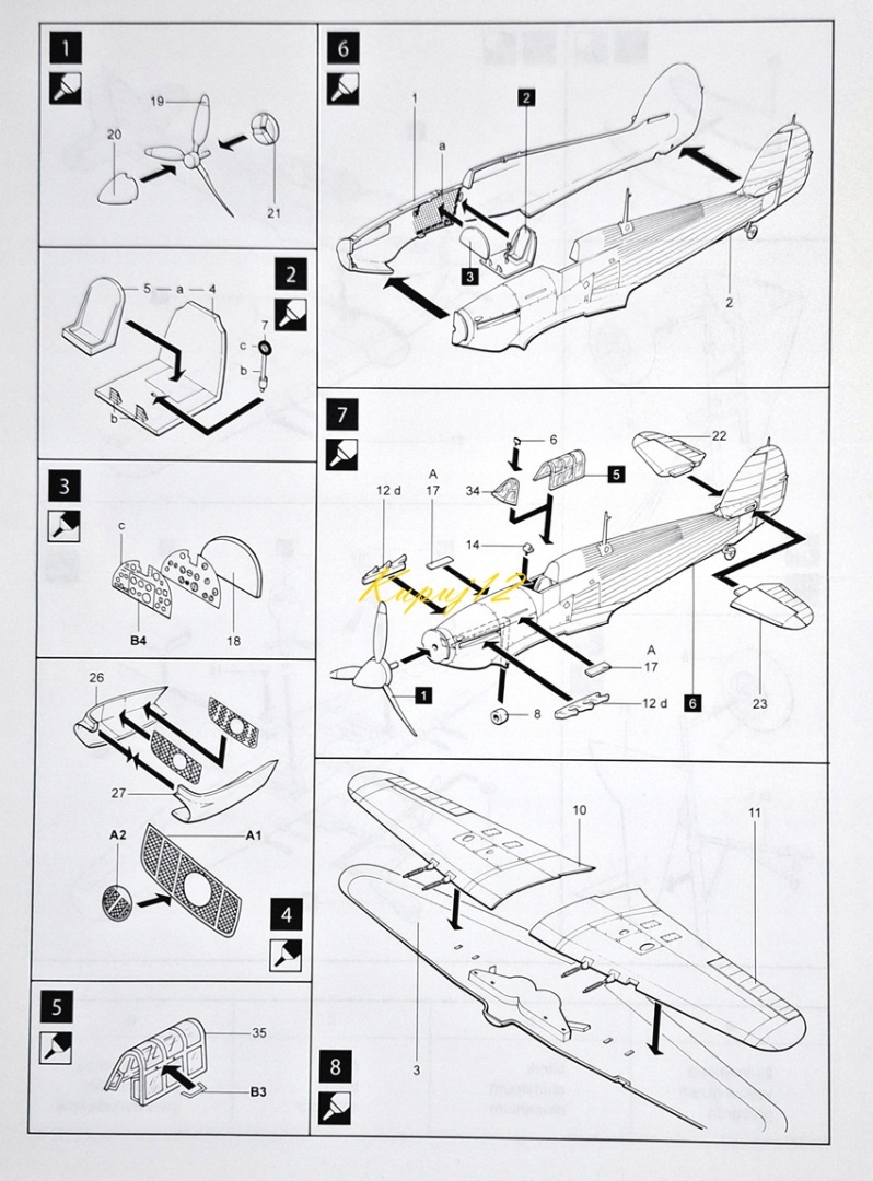 Пластикові елементи повинні бути вирізані з кадрів, підходити та склеювати відповідно до прикріплених інструкцій складання.
