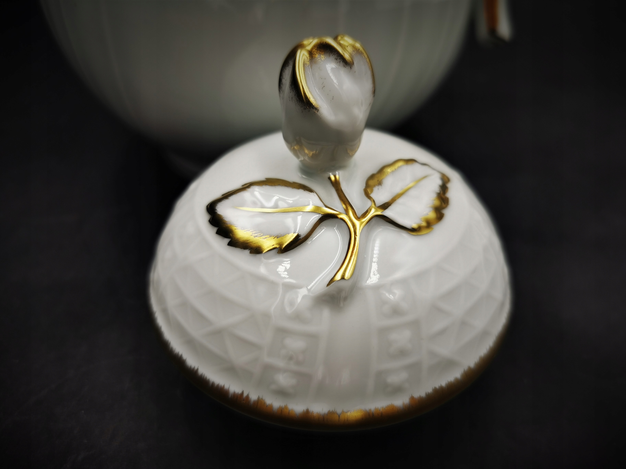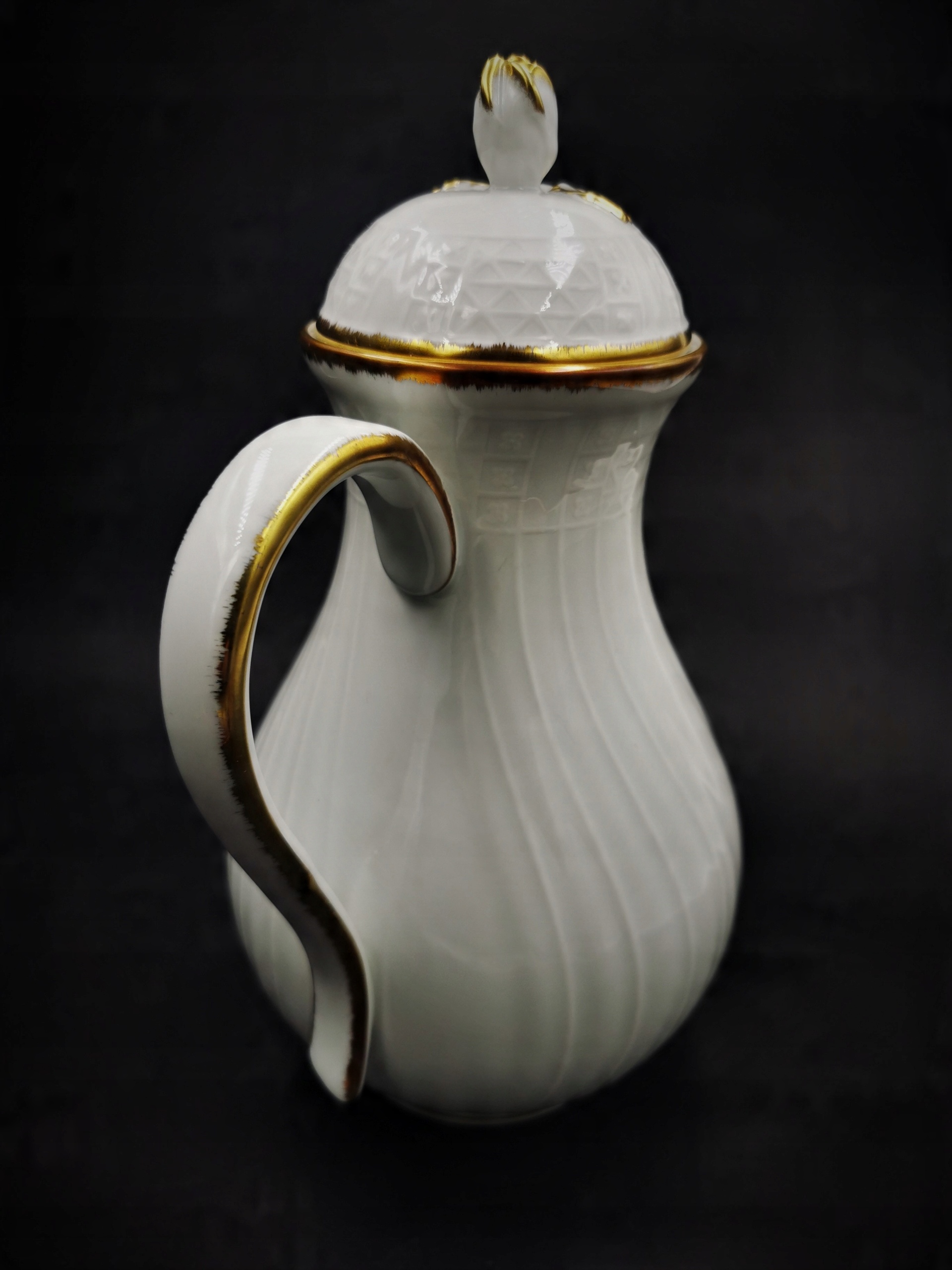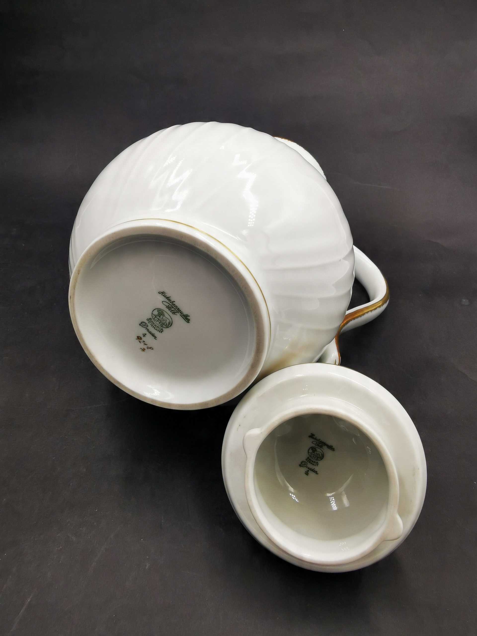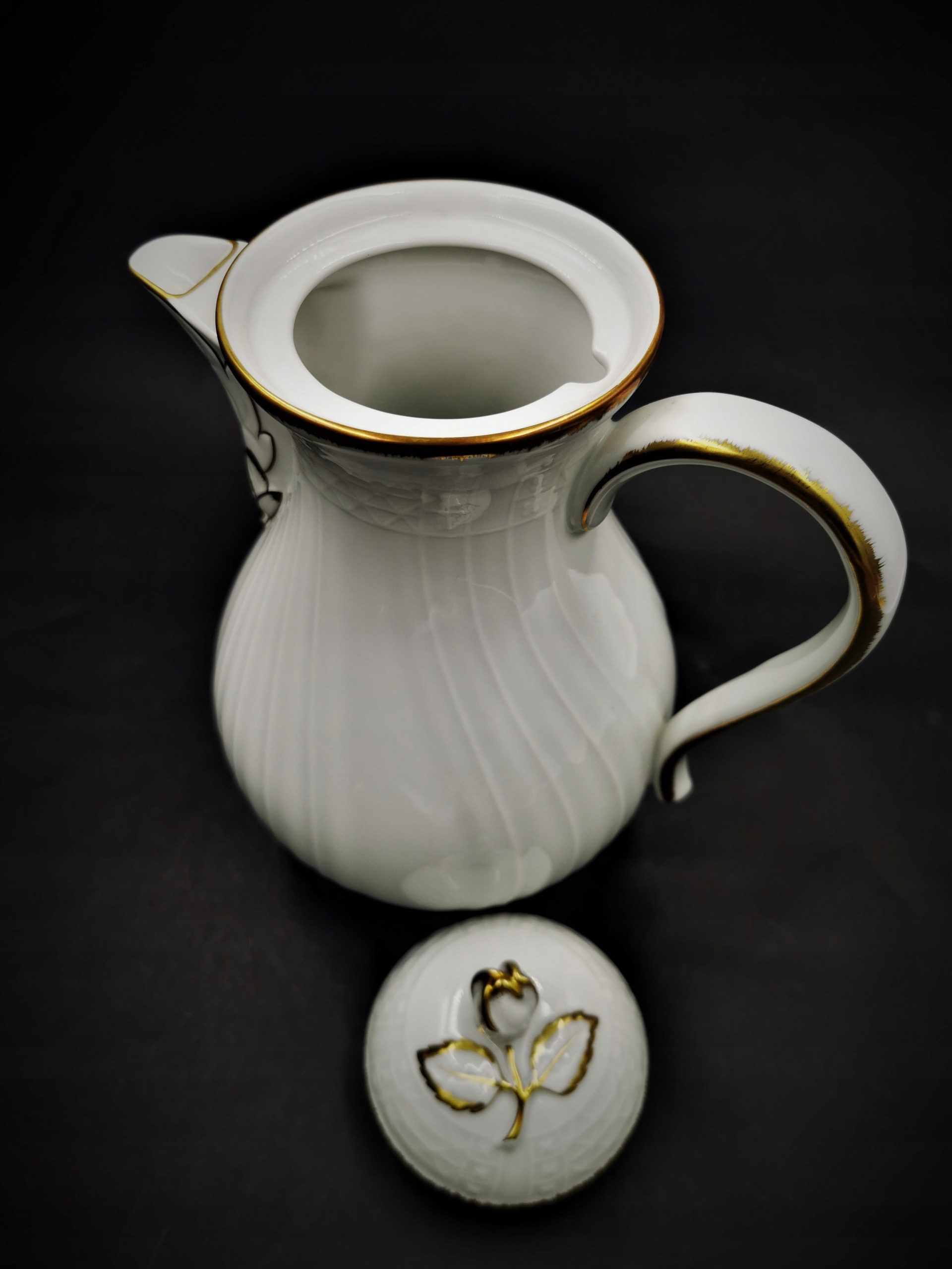 Чудовий глечик від баварської фабрики - Hutschenreuther. Глечик виготовлений з високоякісної білої глазурованої порцеляни та має підпис, який використовувався з 1969 року. Його безперечною перевагою є тонкі рельєфні прикраси, характерні для дрезденської колекції, з якої він походить. Елегантне золоте покриття, що прикрашає краї посудин, додає додатковий клас.