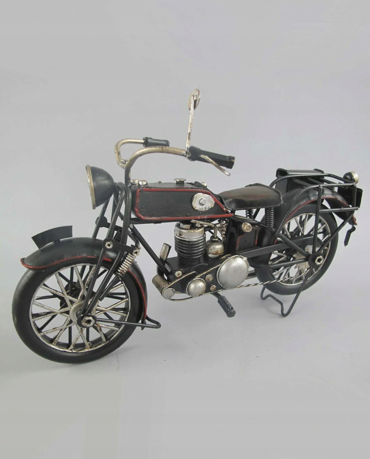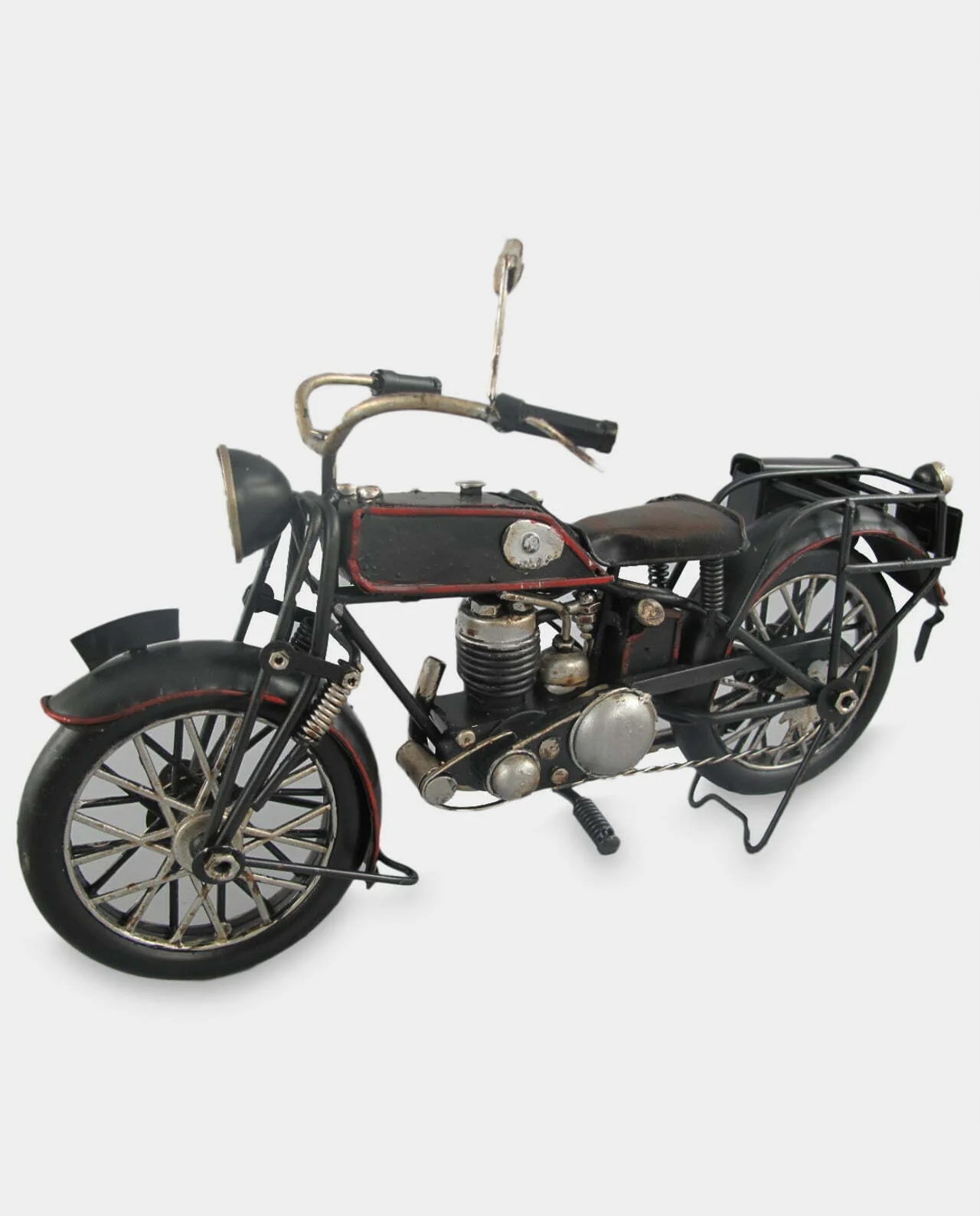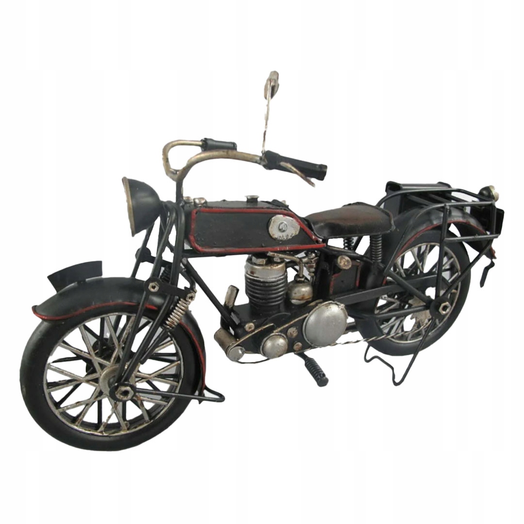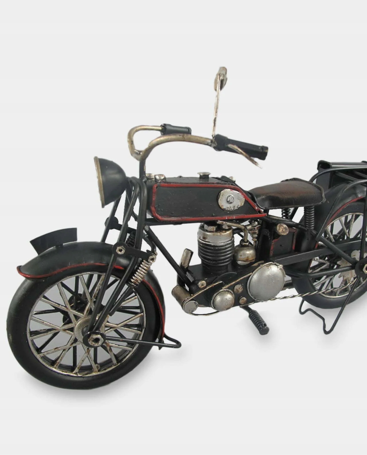 Вінтажна модель із зображенням чорного мотоцикла Victoria, виконана з металу дуже точно, з увагою до найдрібніших деталей. Модель двигуна справляє чудове естетичне враження та має позачасовий стиль. Підійде для багатьох інтер’єрів, як прикраса або як цікава ідея для подарунка.