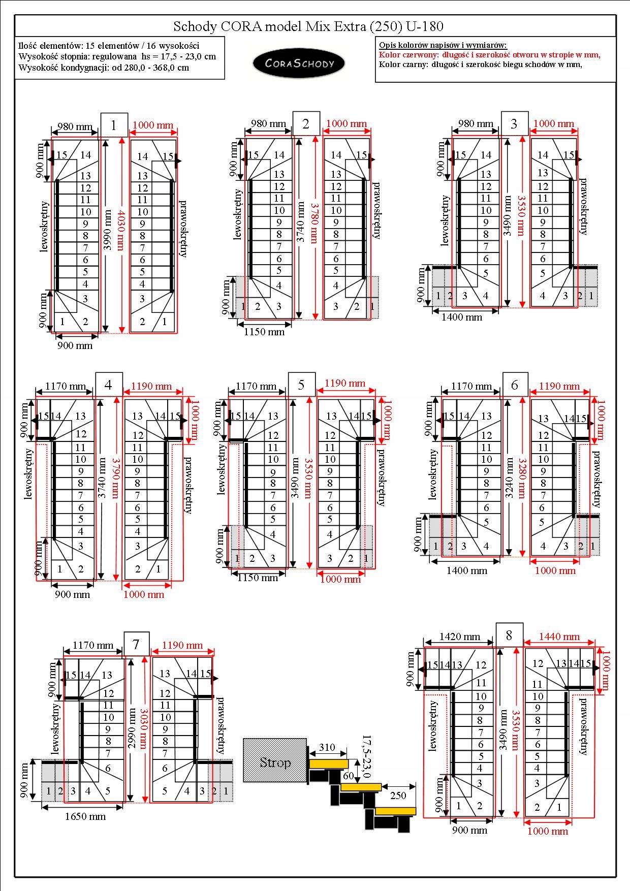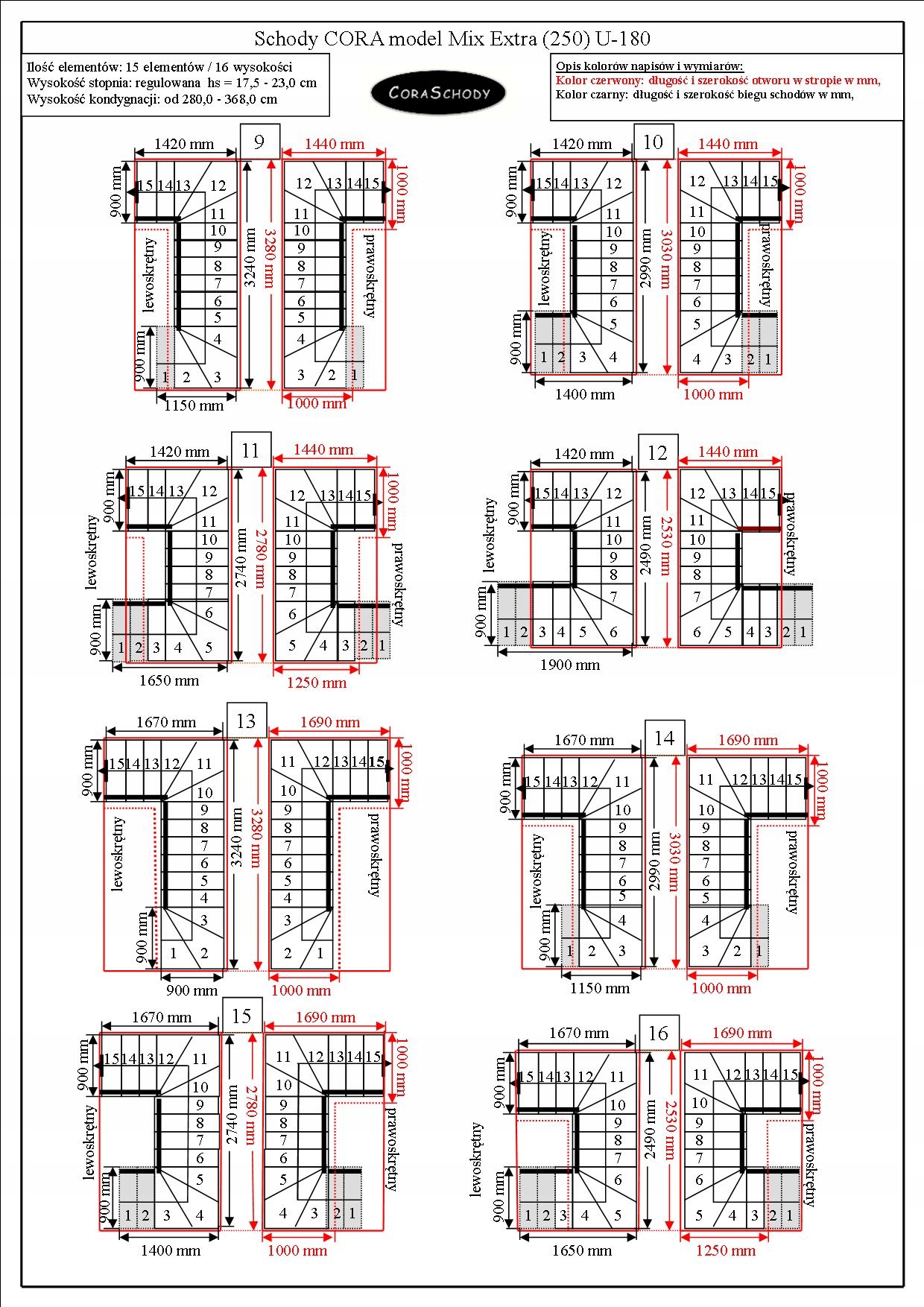 Набір включає 15 елементів сходів, складених на 16 рівнів. Елементи виготовлені з твердої деревини (колір на вибір кольорової палітри виробника) та порошкоподібної сталі в чорній конструкції Matt (RAL 9005). Після замовлення послуги за додаткову плату, виробник виконує професійну установку в країні. Ця модель має оригінальне лікування U-180, як правого, так і зліва. Можна замовити просту процедуру після додавання анотації до форми замовлення.