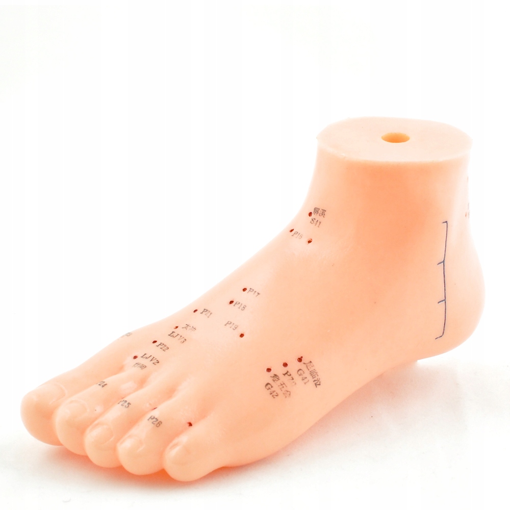 На моделі показано найважливіші точки акупунктури стопи за допомогою арабських і китайських ієрогліфів.