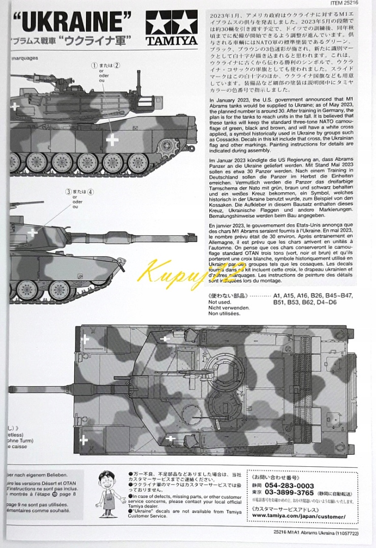 У набір входить пластиковий макет американського танка M1A1 Abrams в українських кольорах 2023 рокув масштабі 1:35.